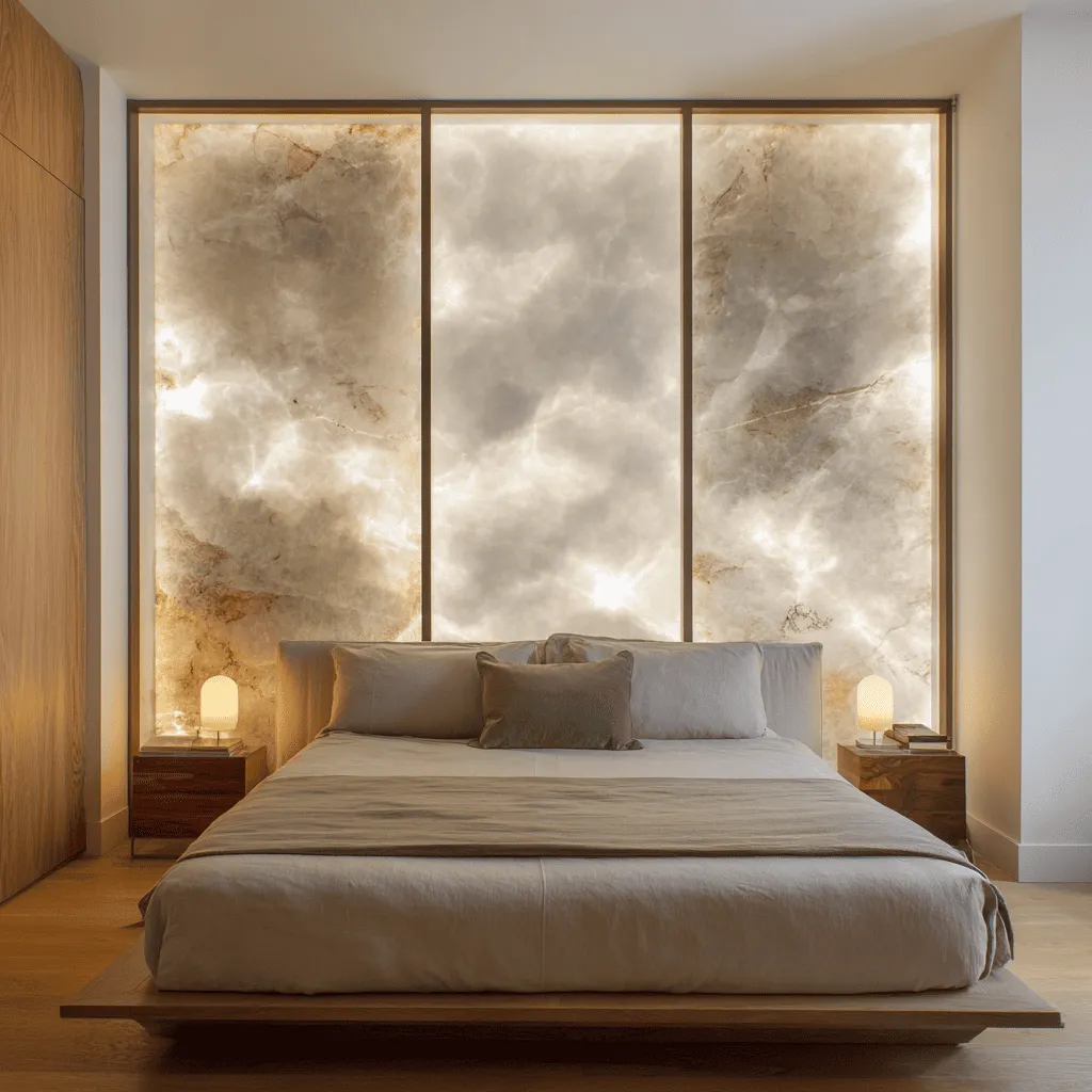 Backlit art-glassresin wall as the headboard substitute with a glowing backdrop that replaces the headboard entirely.