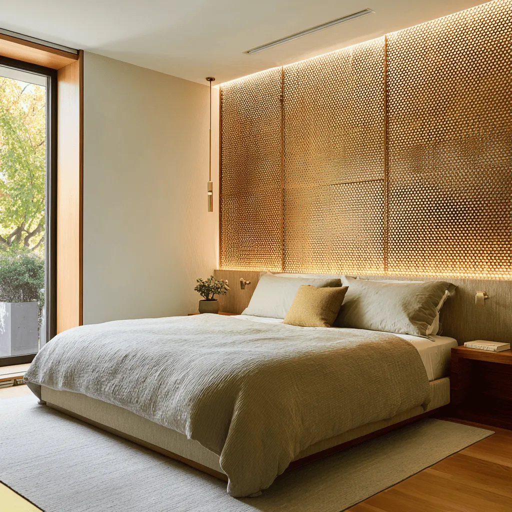 Backlit perforated screen as the headboard alternative a glowing texture field that replaces art, replaces a tall headboard.