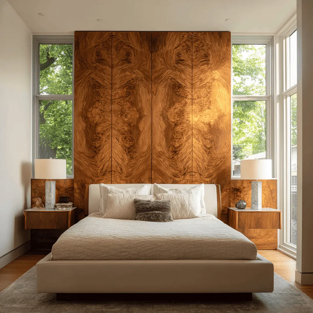 Bookmatched veneer wings take the idea of wall-as-art and give it ceremony through symmetry. Mirrored grain patterns create a center axis that the bed can sit within, almost like the wall is folding inward to hold the sleeping zone.