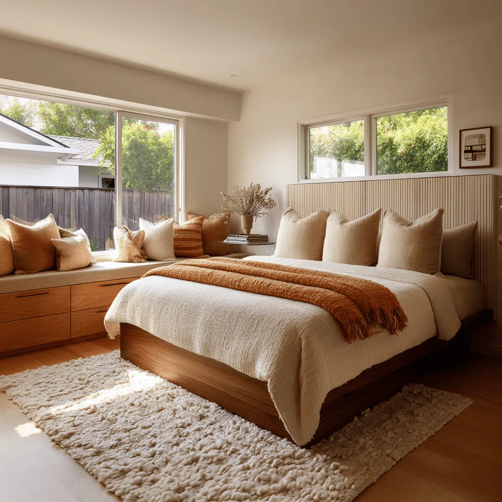The headboard effect comes from rhythm plus light, not from thickness. Then the bench, although not directly behind the bed, completes the wall by echoing pillow language in a different scale: smaller cushions, varied tones, and a more casual cluster.