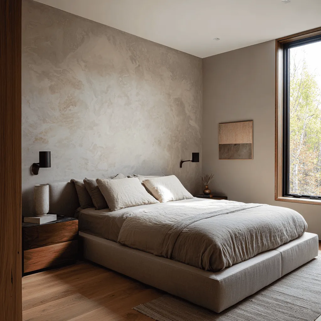 This is easy to miss and crucial: when wall texture is too fine, it can make textiles look messy by comparison; when wall texture is broad, textiles look intentional and soft. In the corner-wrap plaster idea, the wall’s large-scale movement provides depth, while the window view supplies fine organic pattern from trees.