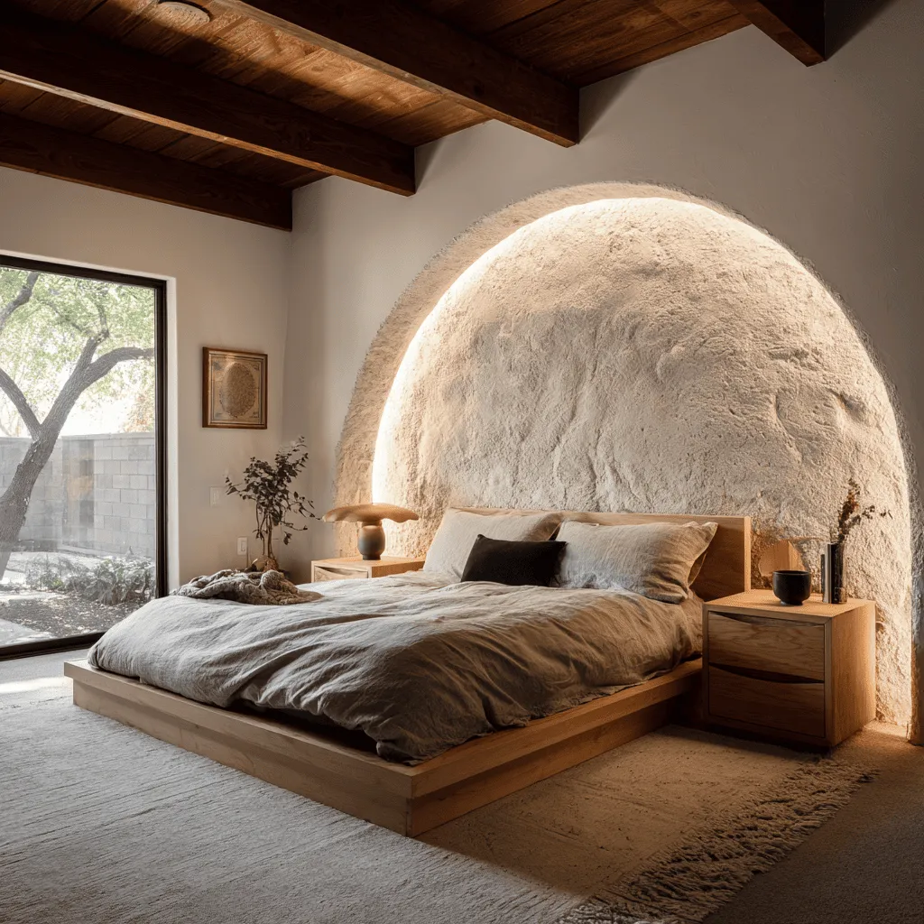 Curved plaster halo wall as the headboard alternative as a sweeping sculptural form with concealed glow that makes the bed feel sheltered.