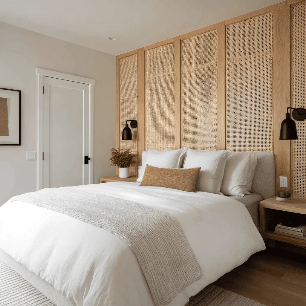 These textile and woven headboard alternative concepts often rely on dual-scale texture: calm from the doorway, rich up close. Cane panel walls do the same.