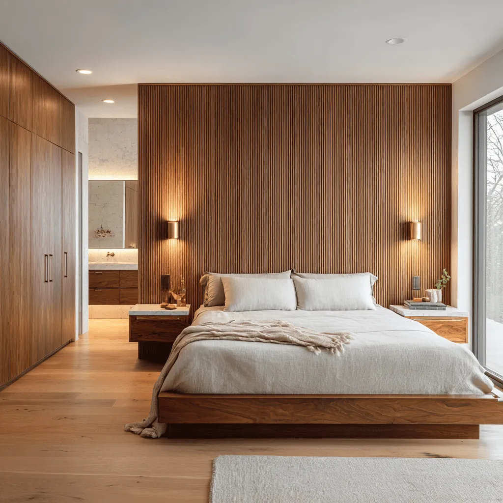 Full-width fluted wood wall as the headboard a texture field that replaces artwork and furniture.