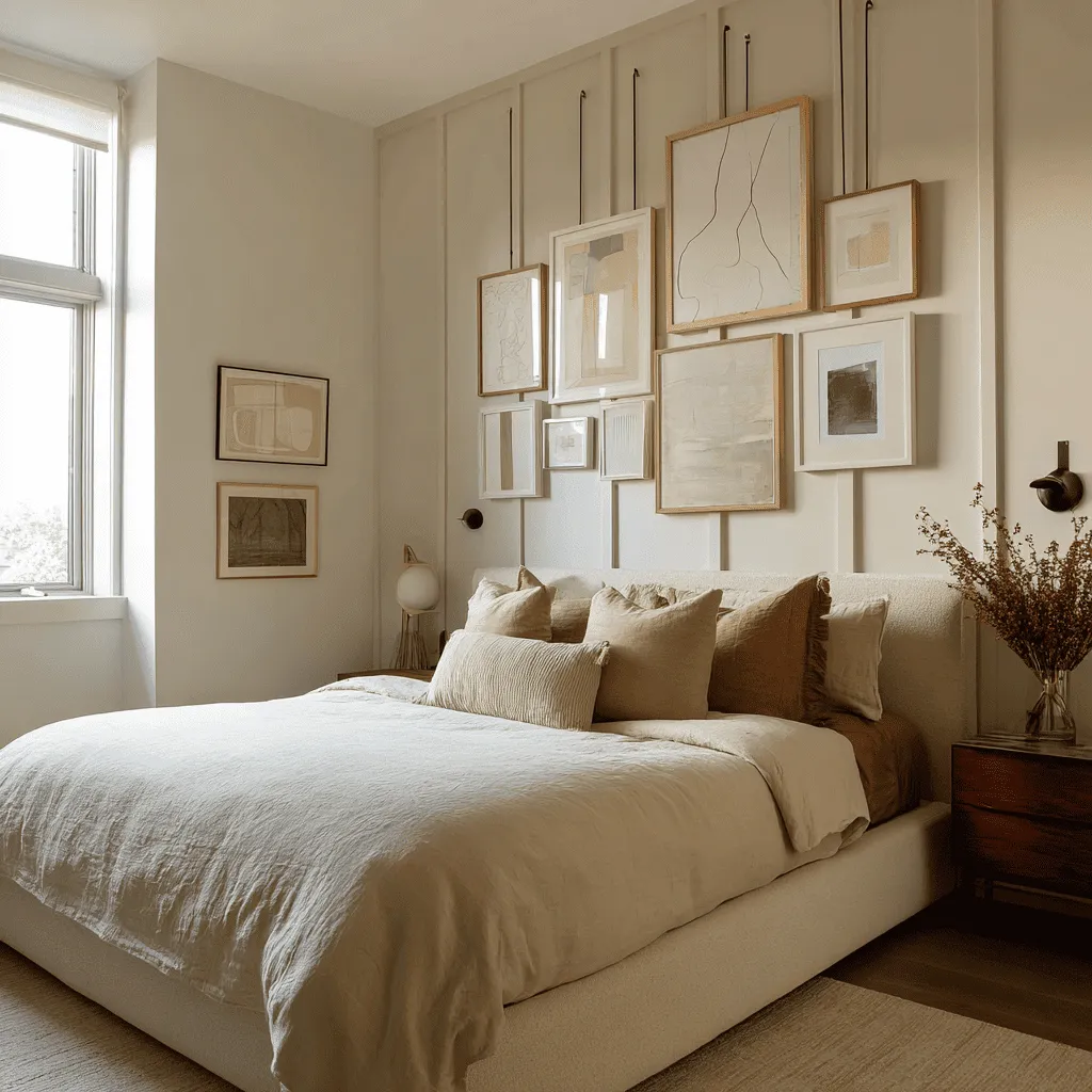 Gallery-rail art wall as the headboard substitute a soft head-zone created by scale, spacing, and vertical rhythm.