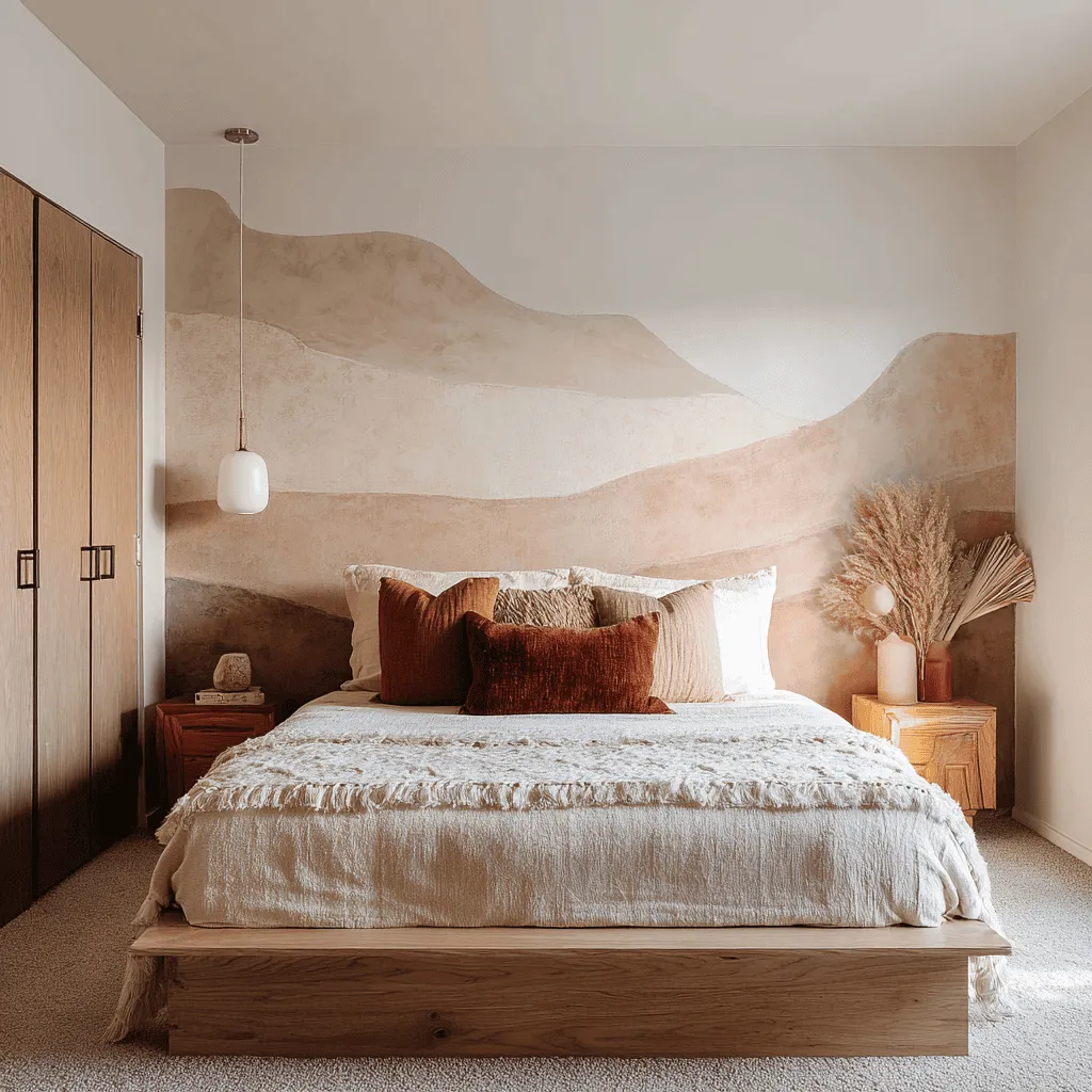 Hand-painted mural as the headboard layered landscape bands that frame the pillows and set mood.