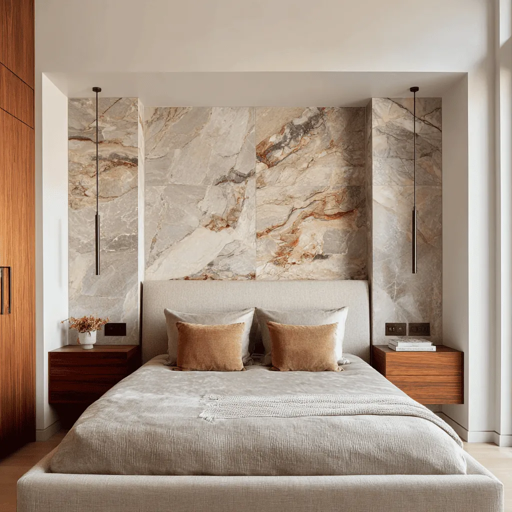 Large-format stone-look slab insert as the headboard as a recessed stone composition that behaves like a calm, architectural backdrop rather.