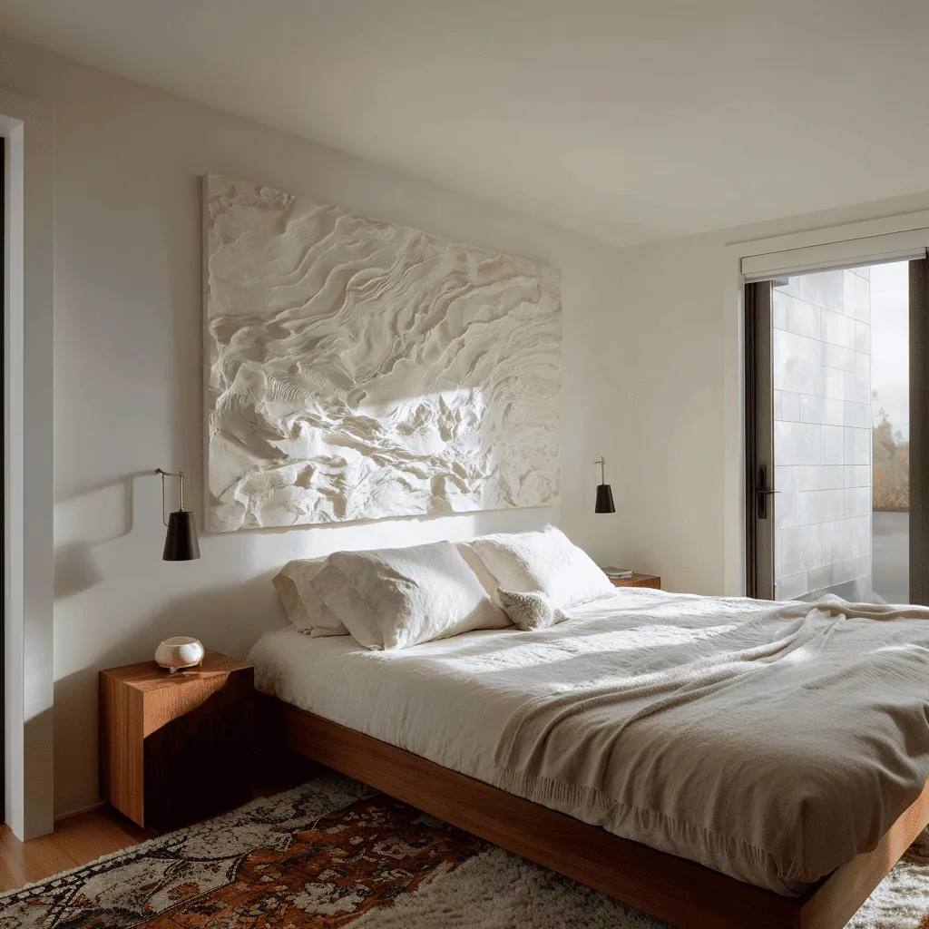 A focal object can be a single large relief, a sculptural wall light, a textile hanging treated as artwork, or a folding screen set behind the bed. Both can replace a headboard, but they change the room’s emotional center in different ways.