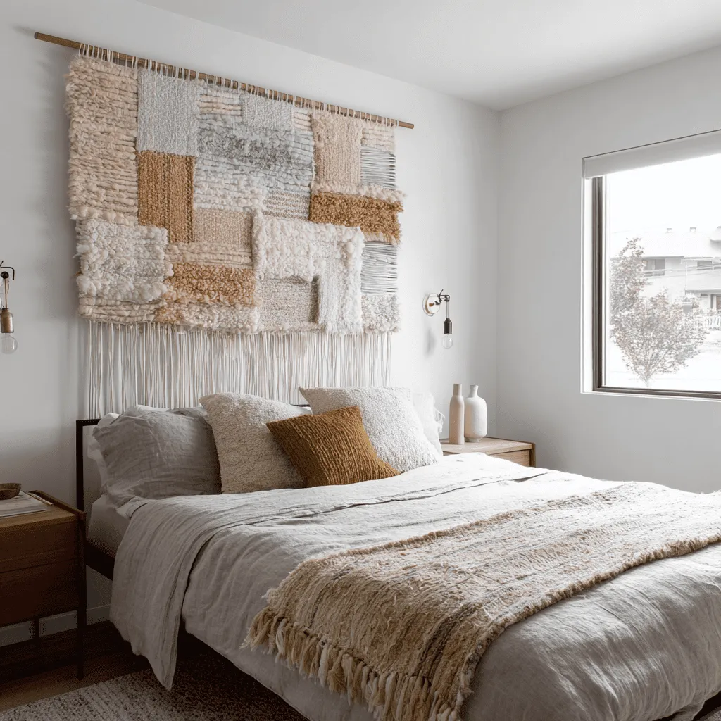 Large textile wall hanging as the headboard a soft wall rug that replaces furniture height.