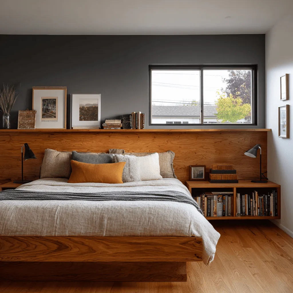 Long shallow ledge as the headboard a continuous mantel line that turns the wall into a lived-in horizon.