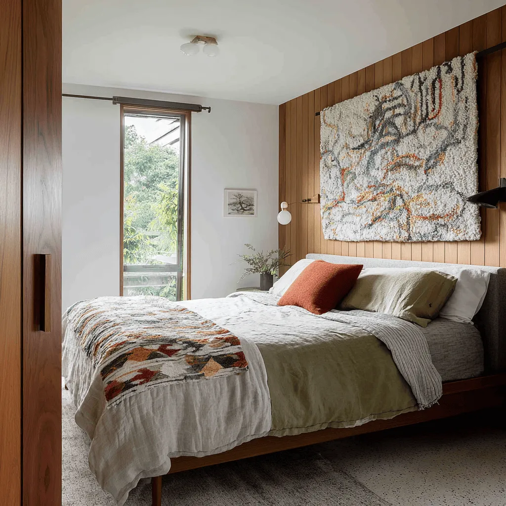 The slats provide a measured background rhythm; the textile supplies irregularity and color. The bedding can echo the textile in a calmer way (one throw with related tones, or one coverlet that borrows a single hue) so the wall feels integrated rather than random.