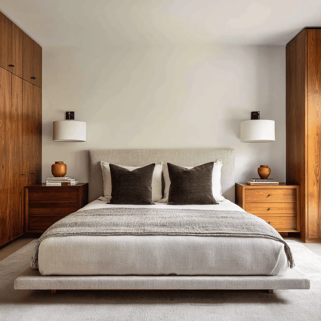 The wall’s job gets handed to proportion, symmetry, and bookends. Tall wood volumes at the sides act as brackets; lamps become the main graphic; darker pillows become small weights that prevent the bed from dissolving into pale tones.