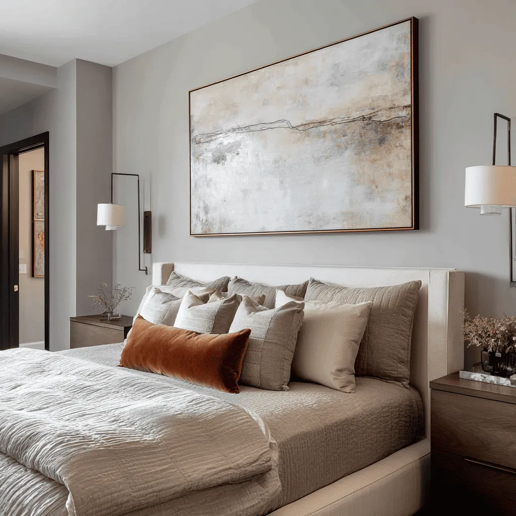 Oversized art panel as the headboard substitute, paired with slim vertical accents.
