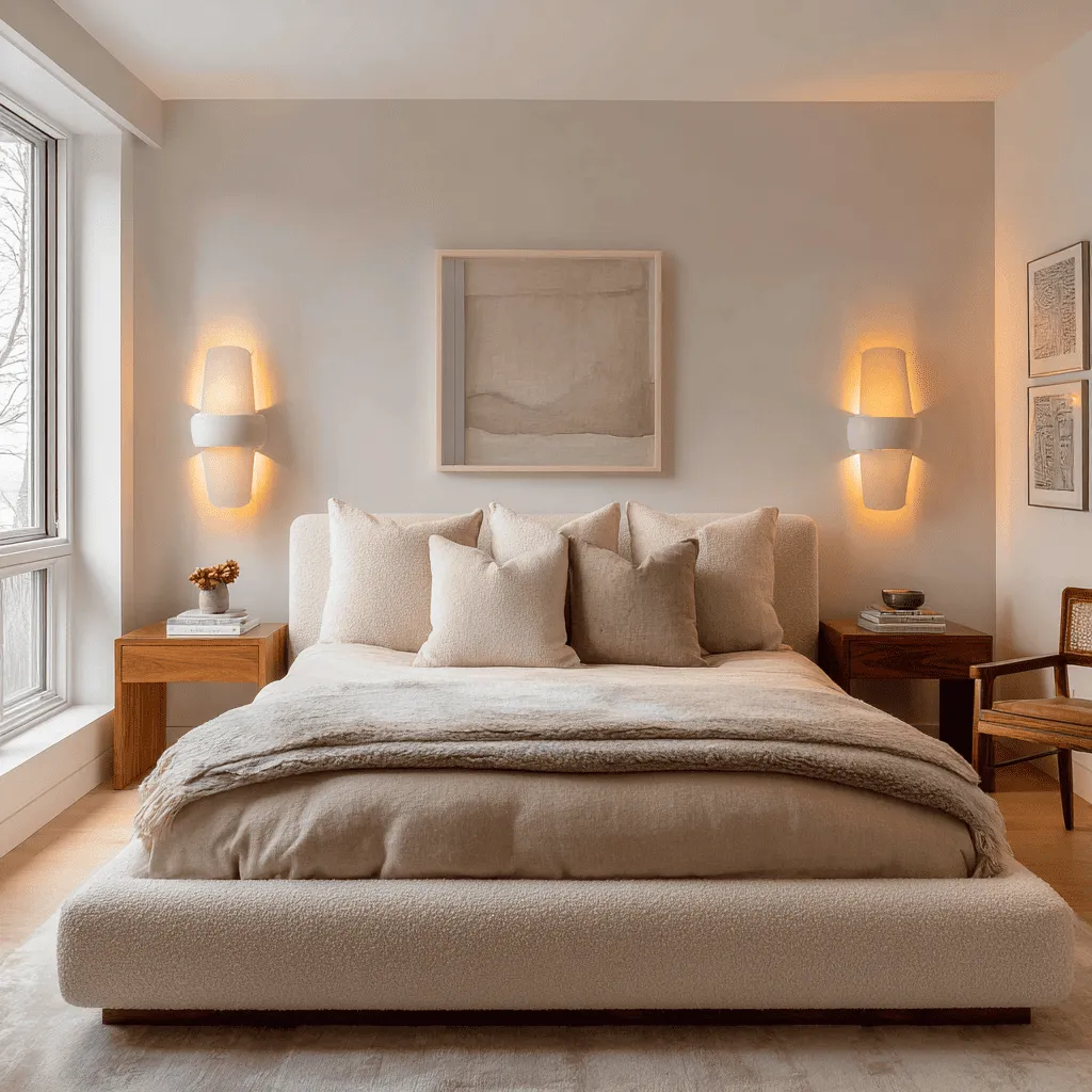 Light-led headboard concepts are especially revealing because they show how much of a headboard’s role is psychological. Two large sculptural wall lights can supply mass, framing, and warmth without altering the wall finish.