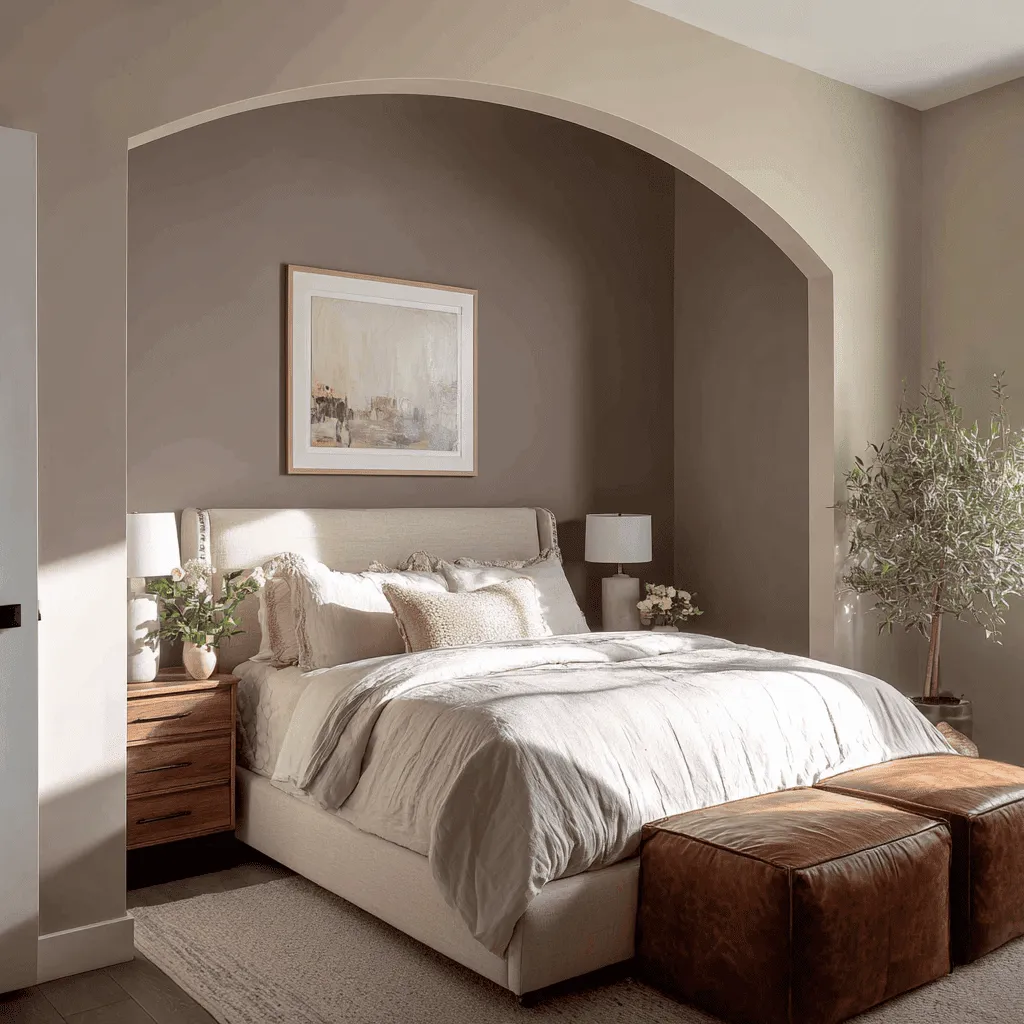 Painted geometry offers a different kind of framing. A wide painted arch creates a shadow-zone effect without building an alcove.