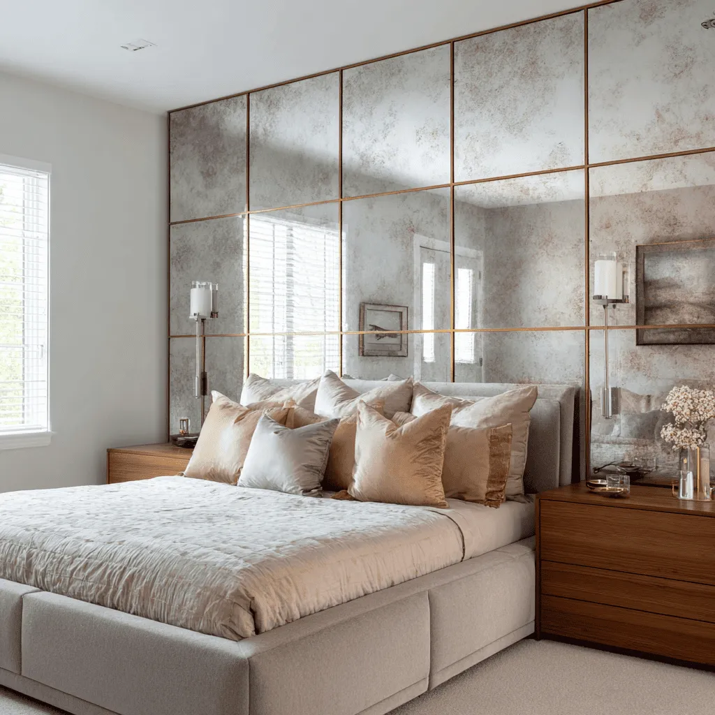 Some alternative headboard concepts can use reflection, because they solve a different visual problem: bedrooms that feel flat. The antiqued mirror grid does not aim for crisp reflection.
