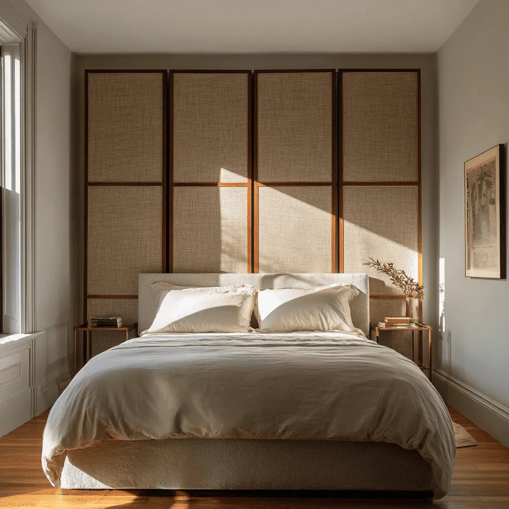 Repeated rectangles in the screen panels create rhythm; woven infill adds tactile detail without a loud motif. Sunlight cutting diagonally through the weave becomes part of the composition, turning the bed wall into something that changes through the day.