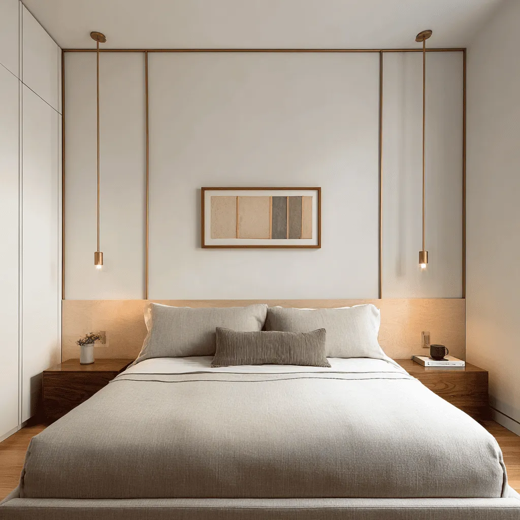 Some of the strongest visual control, interestingly, comes from ideas instead of a headboard that are basically line drawings on the wall. The brass rail grid with a low wood band makes the bed wall feel like a proportion study.