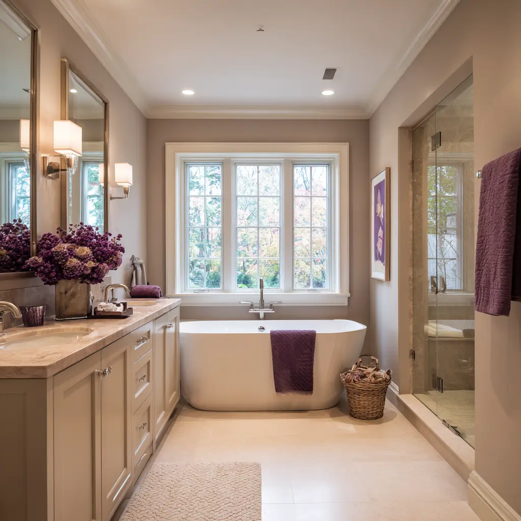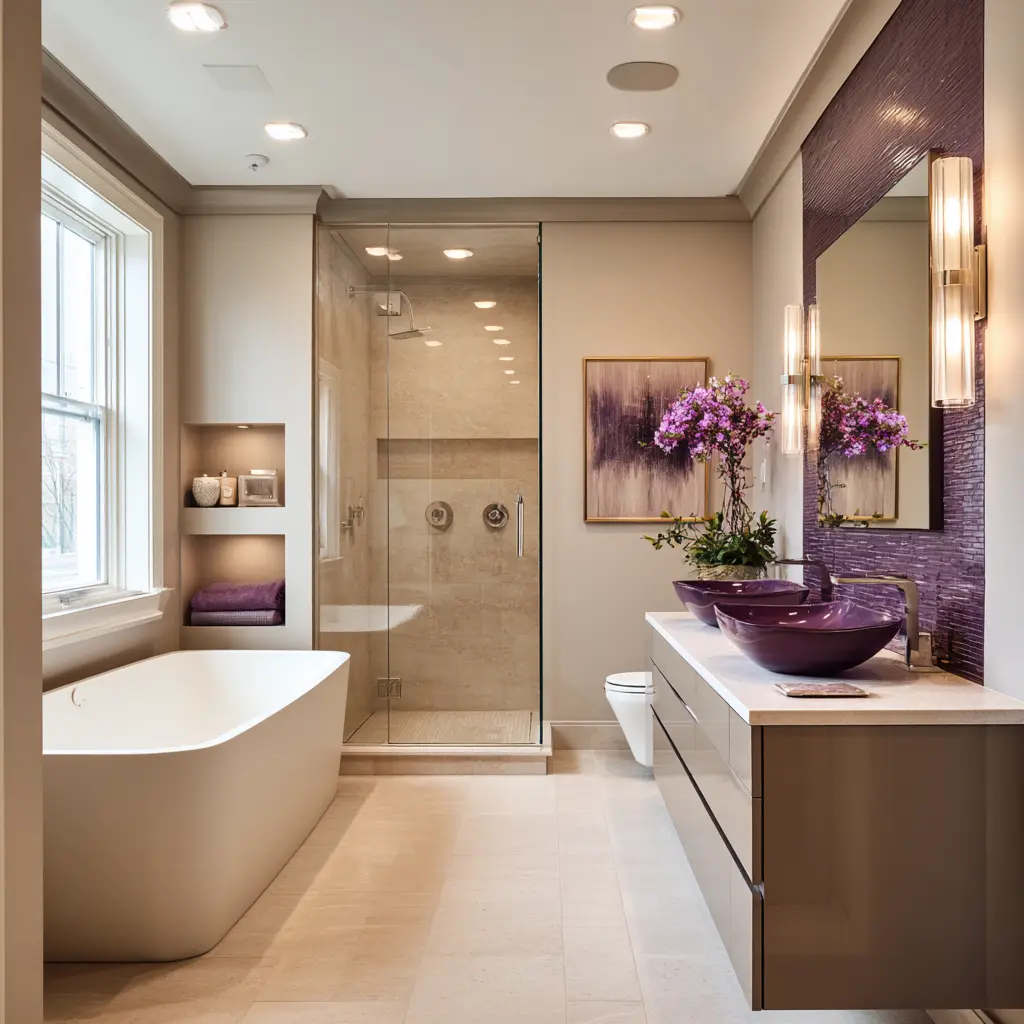 Plum, aubergine, dusty violet, and muted mauve can now appear in a highly controlled way. Instead of filling the room, they are often limited to one textured wall, a small art group, a towel family, or a decorative cluster.