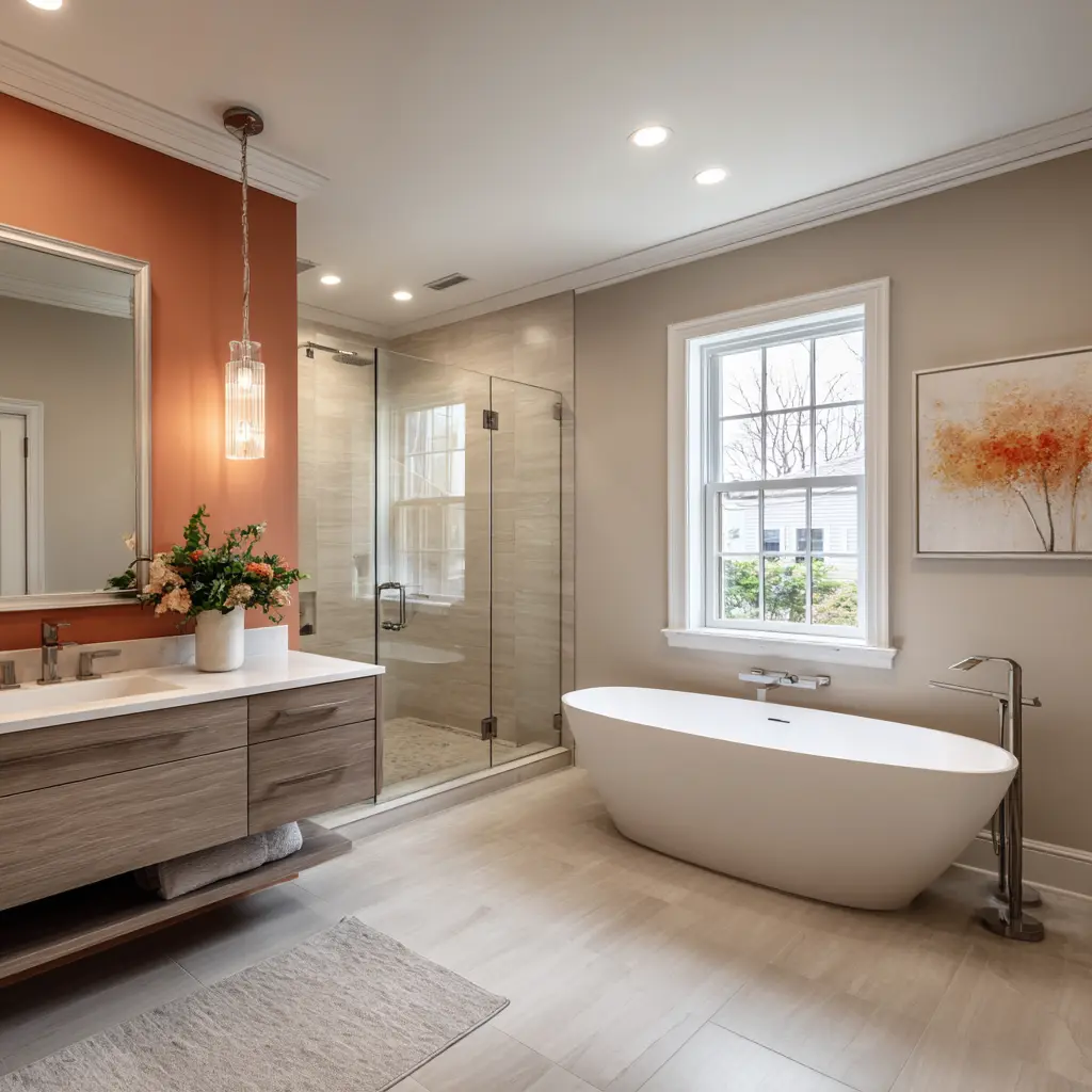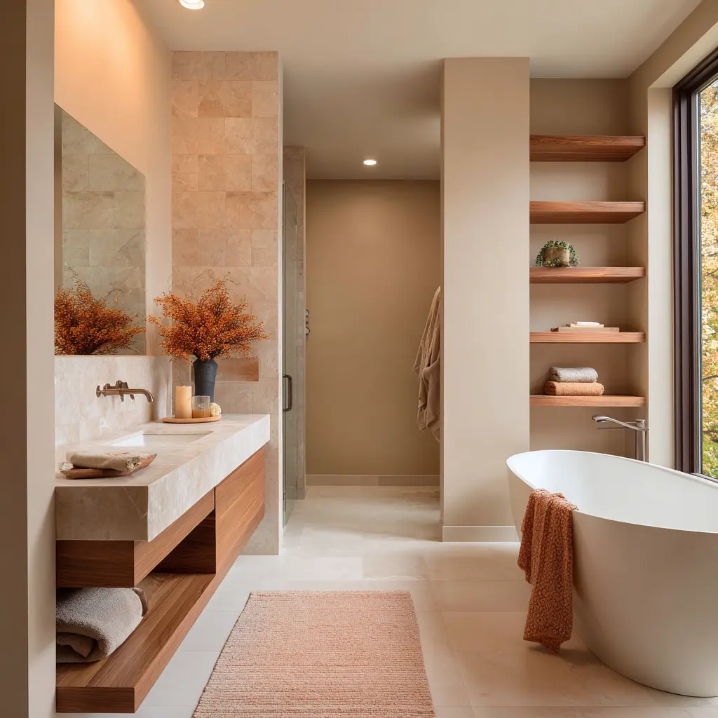 Blush-beige, dusty rose clay, terracotta, apricot warmth, caramel, and cinnamon-rust bring a richer emotional tone to the bathroom without turning loud. These shades are usually softened by beige, grounded with stone and wood, and often limited to one wall or one key area.
