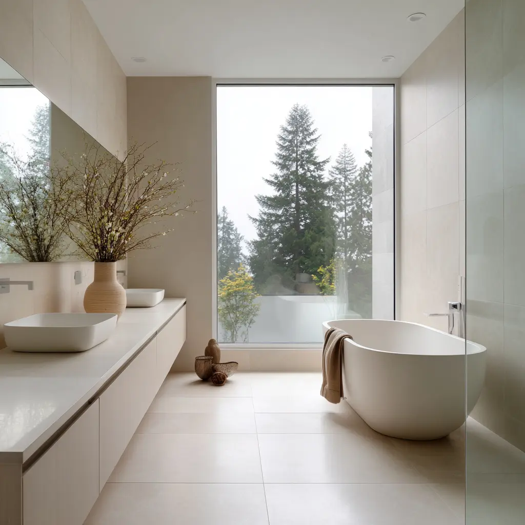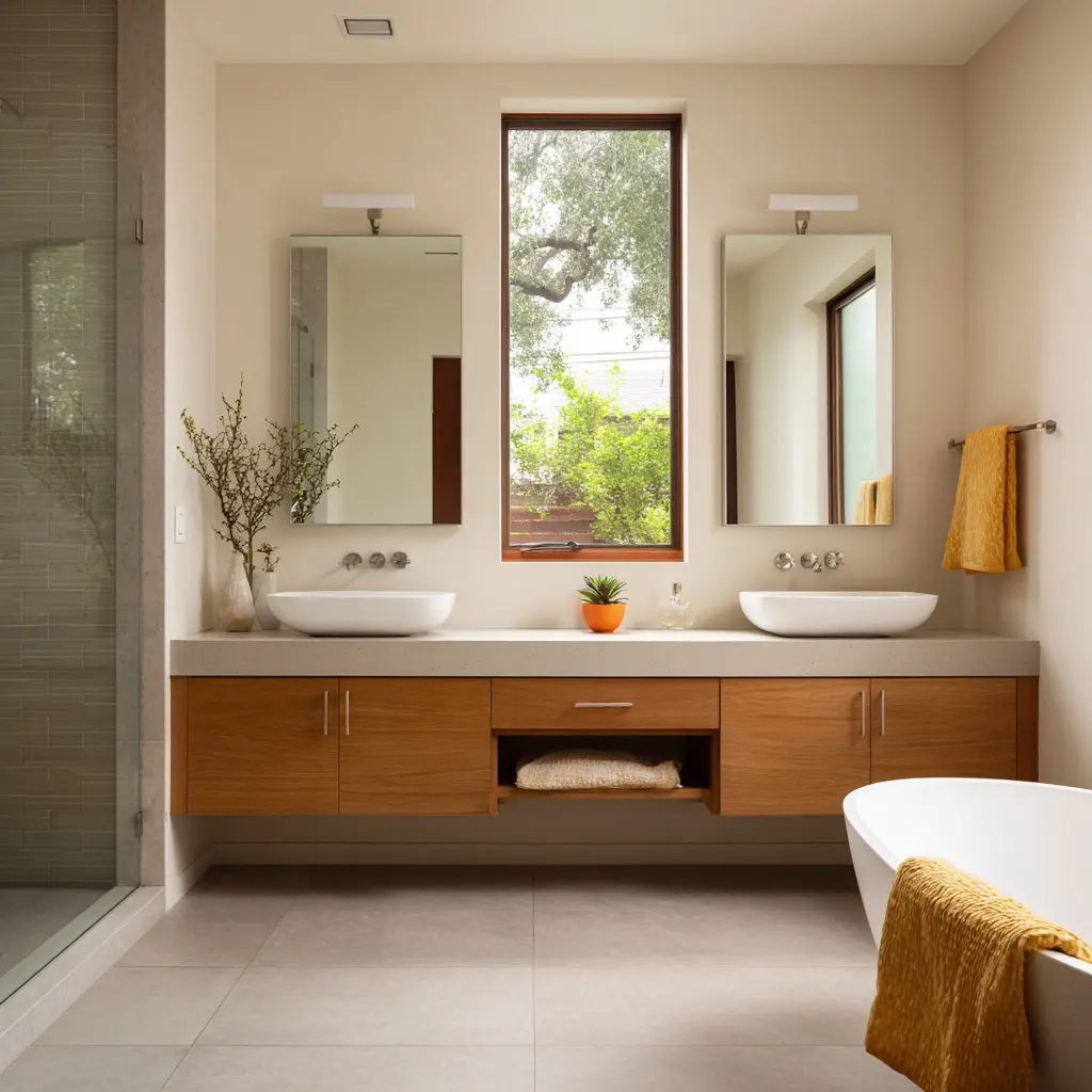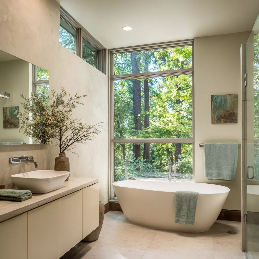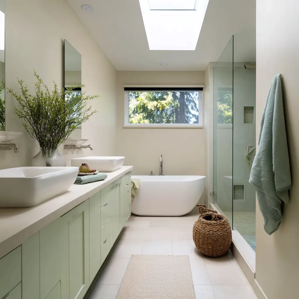 That makes the bathroom feel alive, but it also makes the palette easier to update. If the green comes from plants and the outdoor view, the room gains freshness without the commitment of green tile or cabinetry.