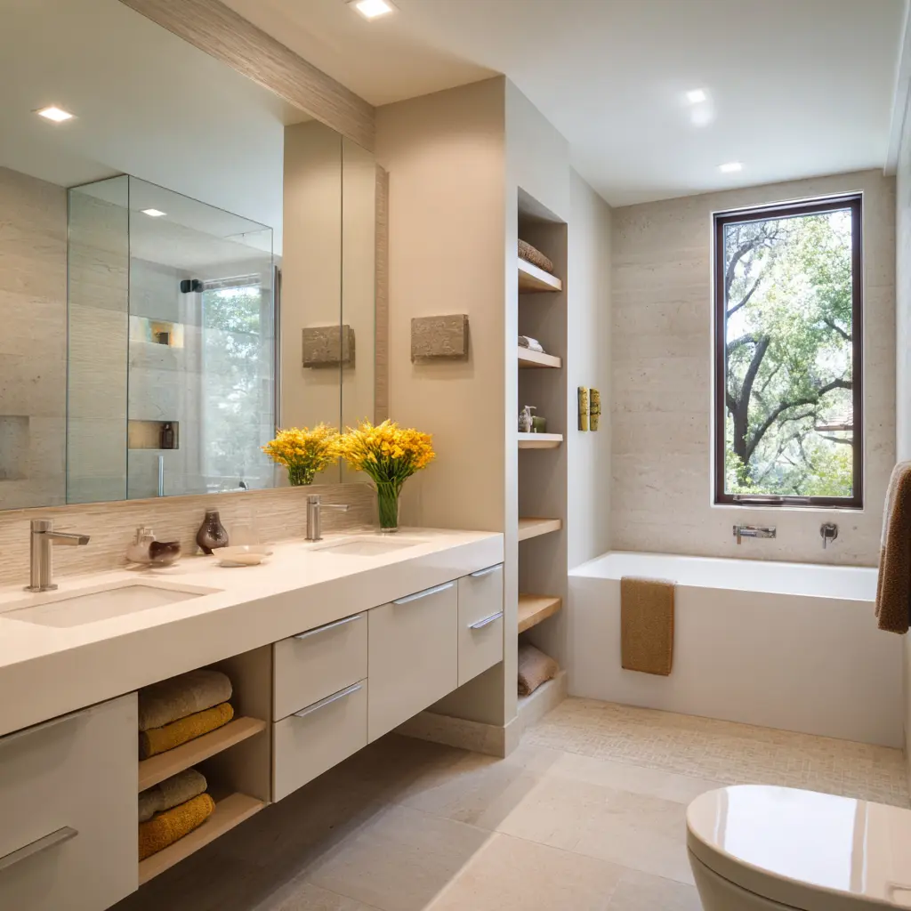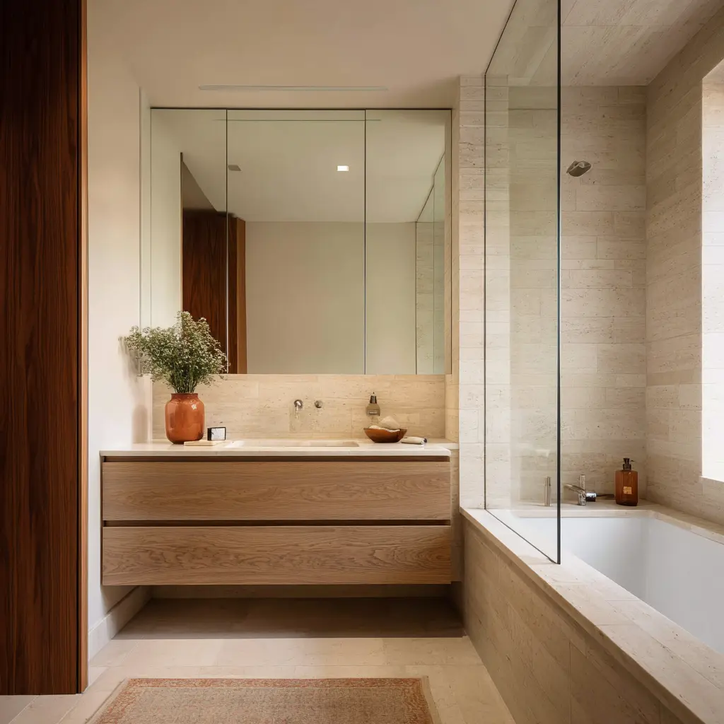 This is a major reason current bathrooms feel rich without looking busy. The design relies less on dramatic color separation and more on shape, surface, and light.