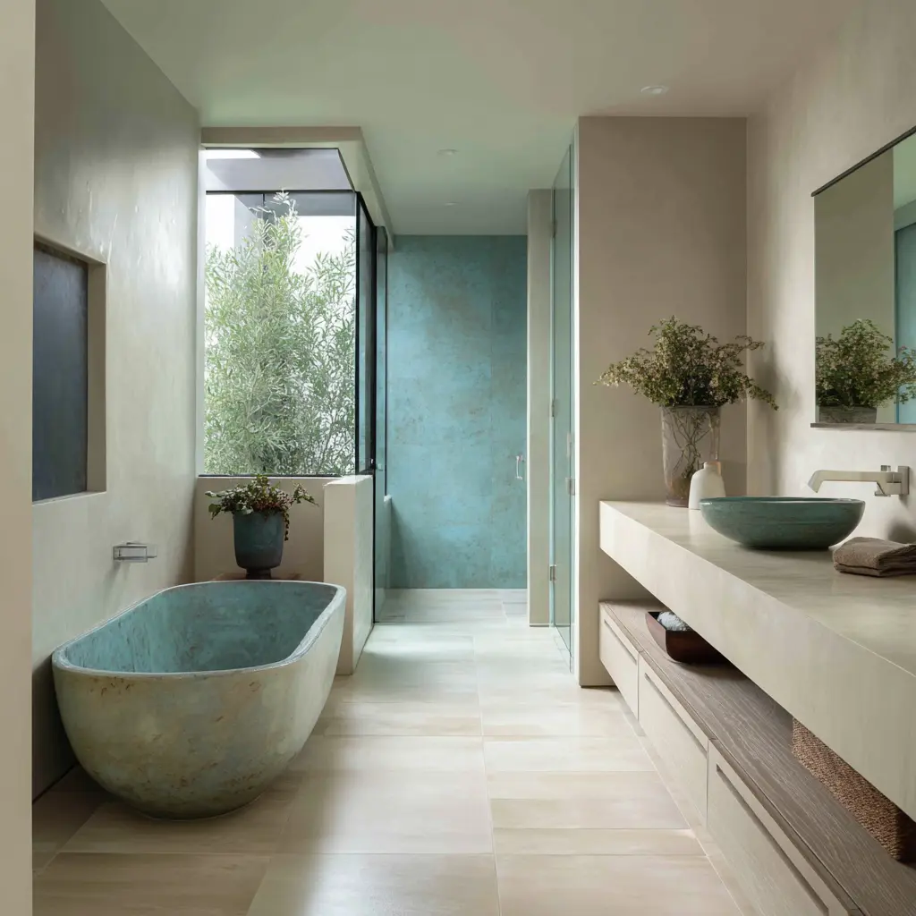 It often appears in art, textiles, a basin, or a patina-like finish. This family brings freshness and a spa-like feel while keeping the room soft and quiet.