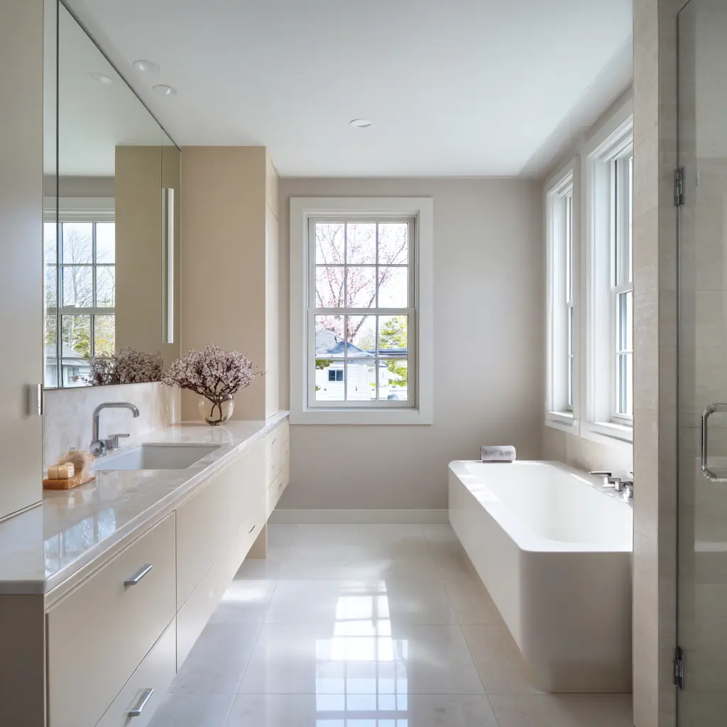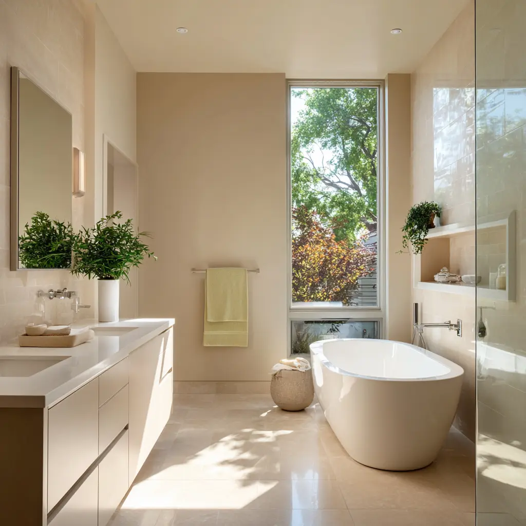 This means color in a current bathroom design is often light-activated. A soft beige wall can feel creamy in evening light, chalkier in daylight, and slightly cooler near a large window.