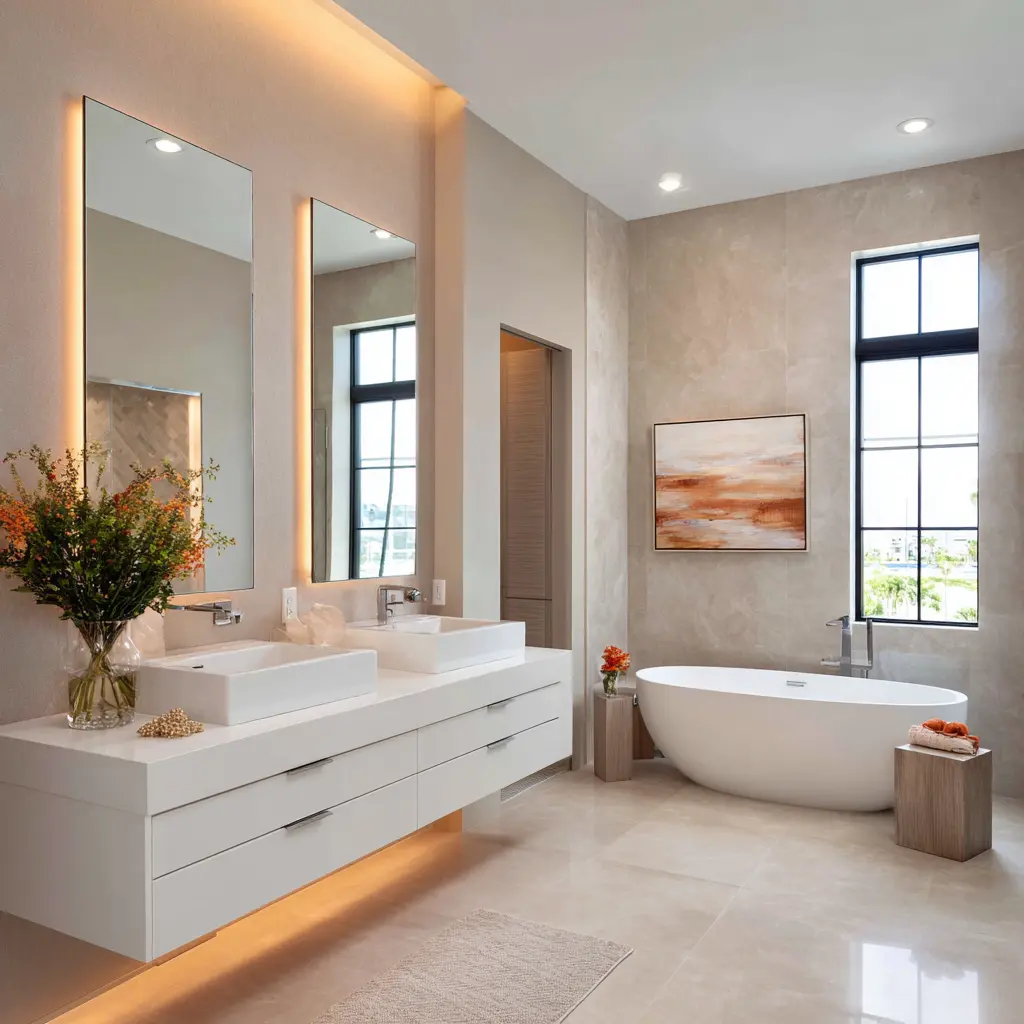 Warm mirror halos deepen beige and taupe undertones. Under-vanity lighting can warm white cabinetry and make it feel less clinical.