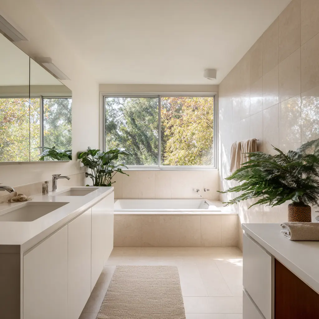 - Let light do part of the work. Daylight, mirror lighting, under-cabinet glow, and reflected greenery all change how the room feels.