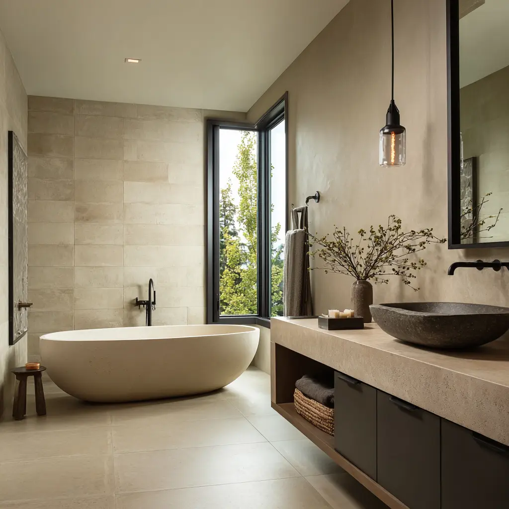 That shift also explains why many current bathroom design concepts feel softer without looking flat. The walls, stone, cabinetry, and wood are often close in tone, but each surface is slightly different in undertone, sheen, or texture.