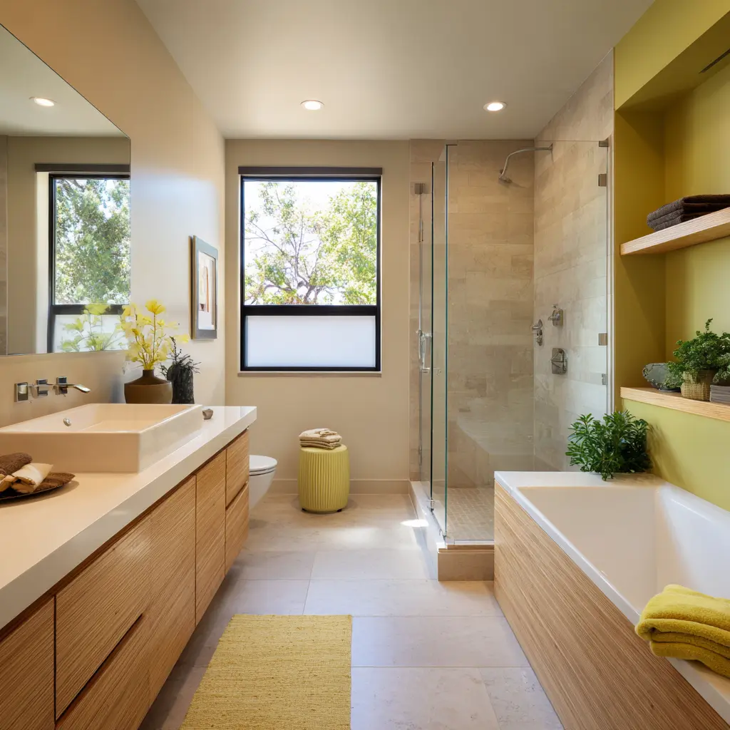 The effect is optimistic and warm, but still controlled. This is a smart option for readers who want a sunnier bathroom without moving into bright, playful color.