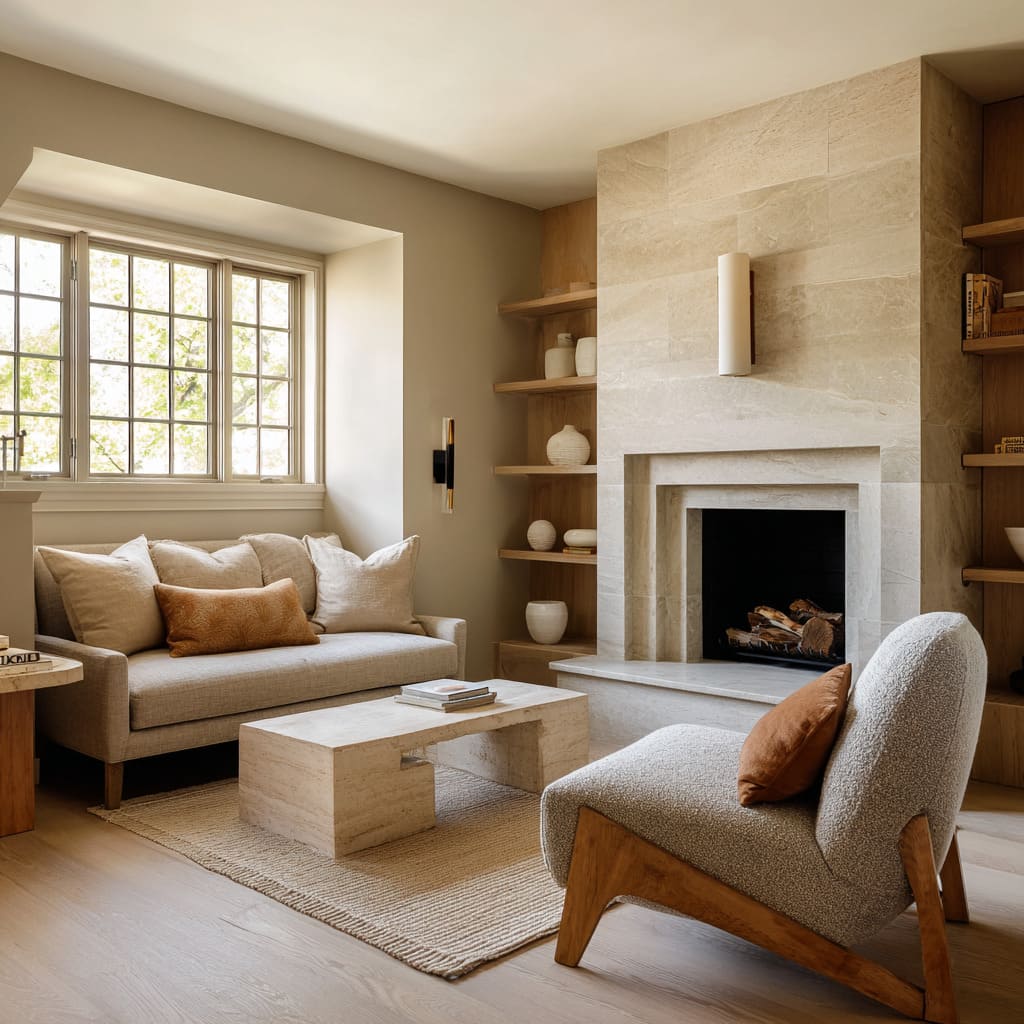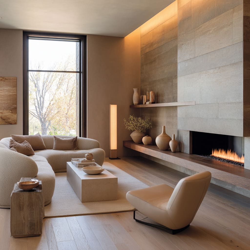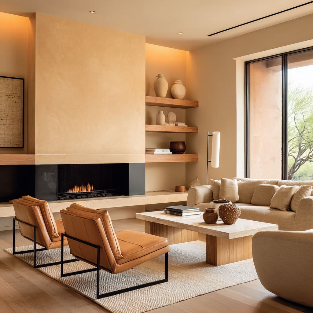These often appear in plaster chimneys, honeyed rugs, and natural fiber textures. They create a “late afternoon” warmth where sconces and firelight can bloom. The fire visually merges into the palette instead of feeling like a harsh orange spot. - Clay-leaning and taupe sand