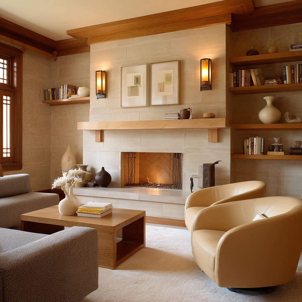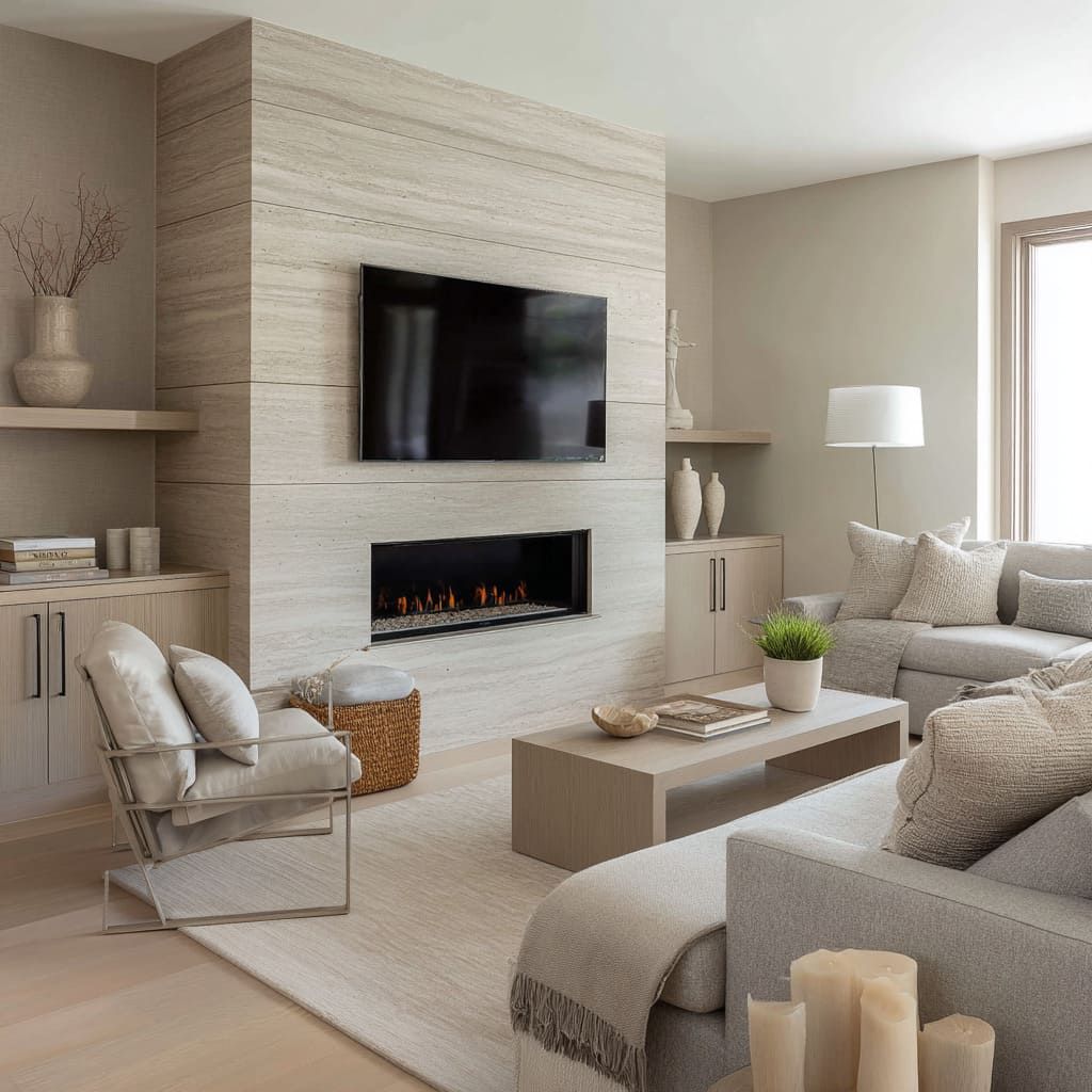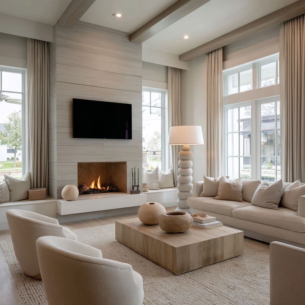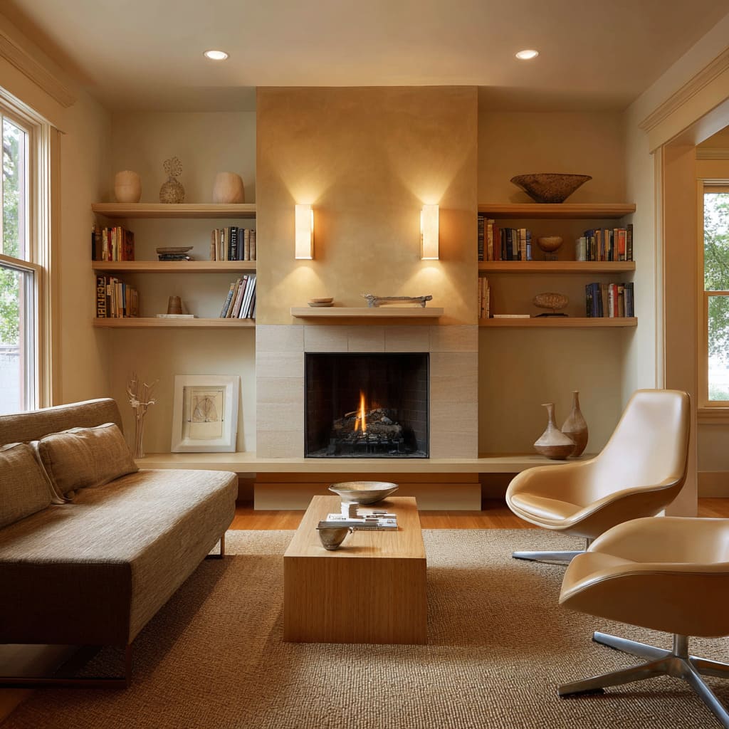 These often appear in plaster chimneys, honeyed rugs, and natural fiber textures. They create a “late afternoon” warmth where sconces and firelight can bloom. The fire visually merges into the palette instead of feeling like a harsh orange spot. - Clay-leaning and taupe sand