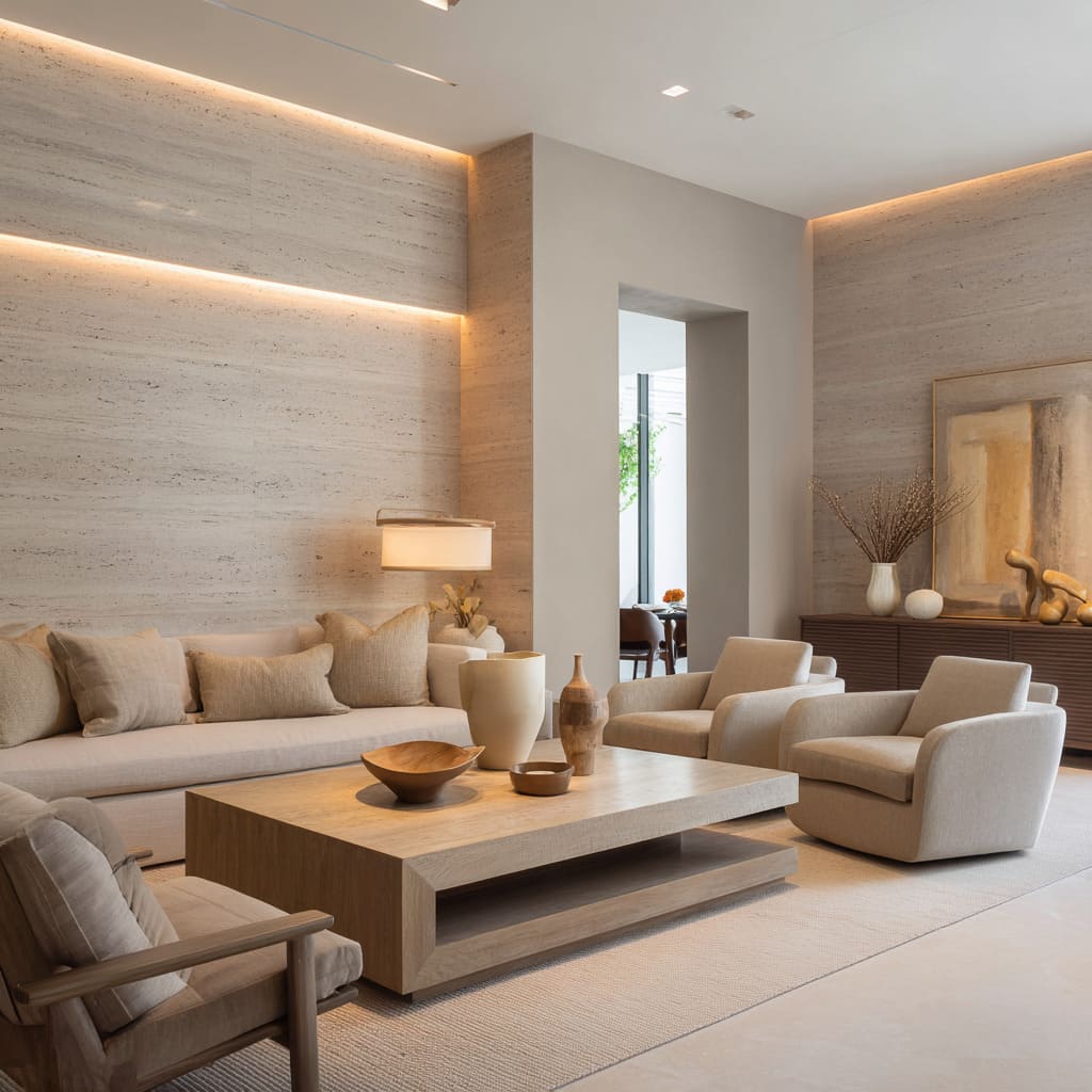 - Gallery-like rooms with large stone planes and long sofas read as calm, sociable spaces; sand is almost white-cube neutral but warmer.