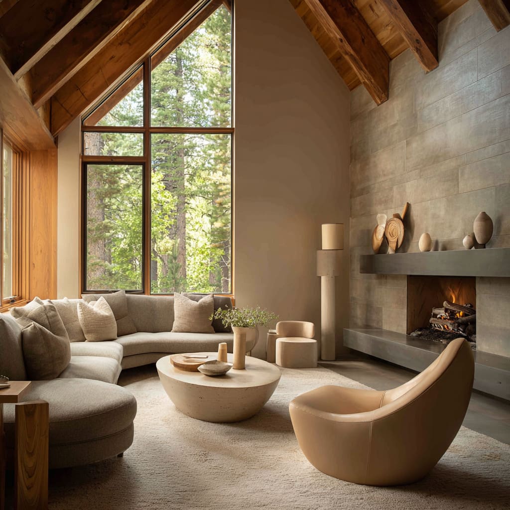 - Forest-lodge-inspired designs partner sand with darker beams, forest green views, and heavier stone. Sand becomes the resting zone between heavy timber and intense greenery.