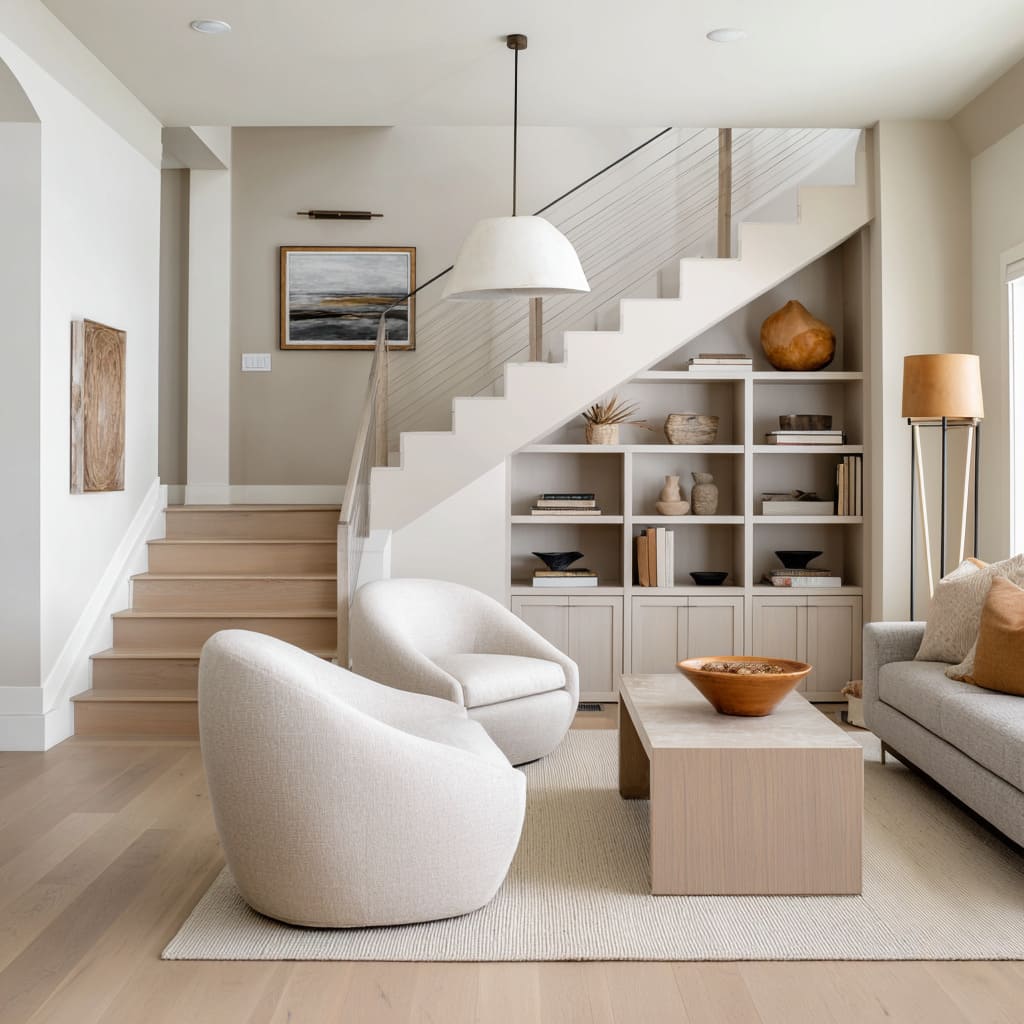 - Stair-landing living rooms rely on sand-painted shelving and pale stair risers to merge circulation space with lounging space; the palette softens what would otherwise feel like transition-only territory.