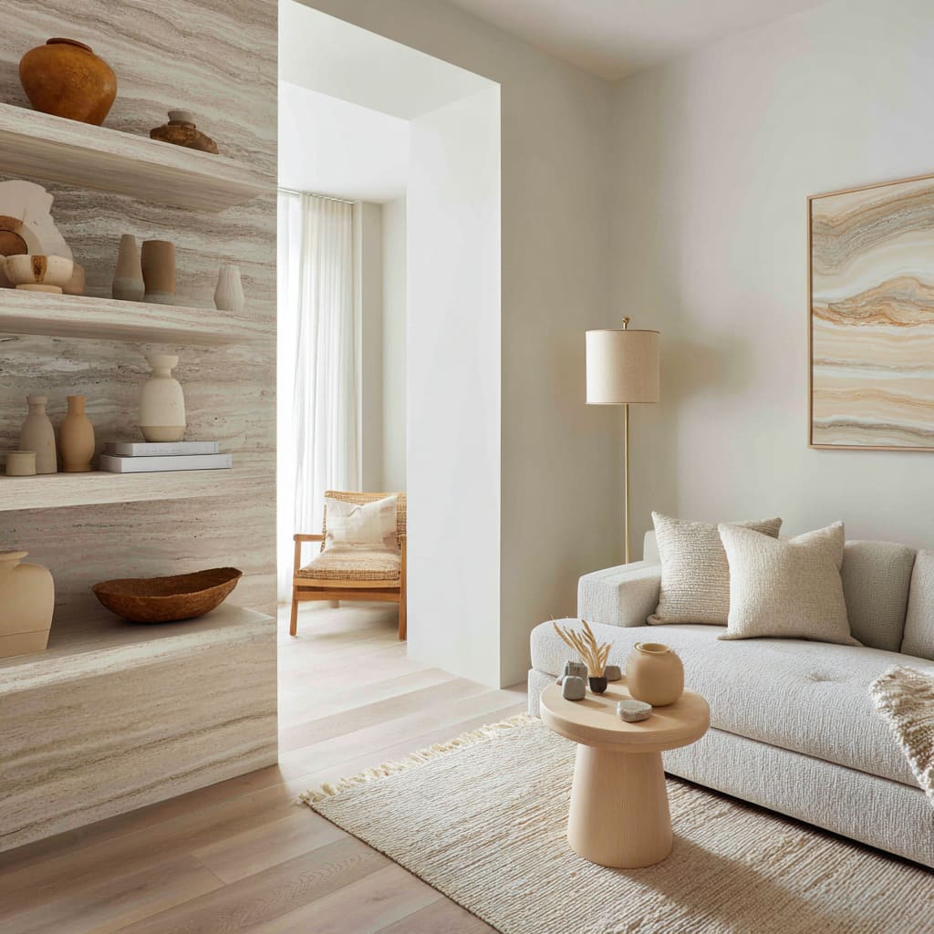Using the same stone for wall and shelves, or letting sand planks wrap recesses and niches, replaces pattern with continuity. People often notice the calm without realizing it comes from the absence of material breaks. - Shape repetition as the new pattern