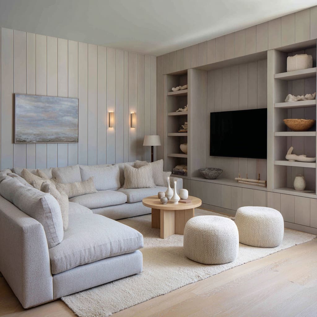 Vertical board-clad shells and quiet, stone-backed media walls. These tones (a little gray, slightly desaturated) feel almost like mist over a beach: calm, cerebral, more “gallery” than “family den.” Cool sand often sits behind TVs and stone slabs, easing the hard black rectangles into the palette. - Warm wheat, oat, and honey sand