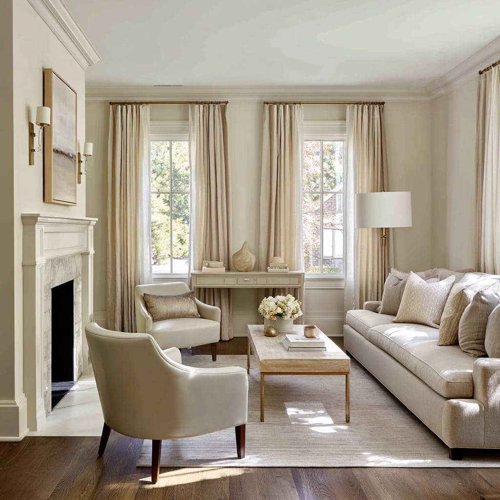 - Traditional parlors can use sand on walls, trim, and drapery to quiet ornate profiles and moldings; the palette pulls classical details into a modern softness.