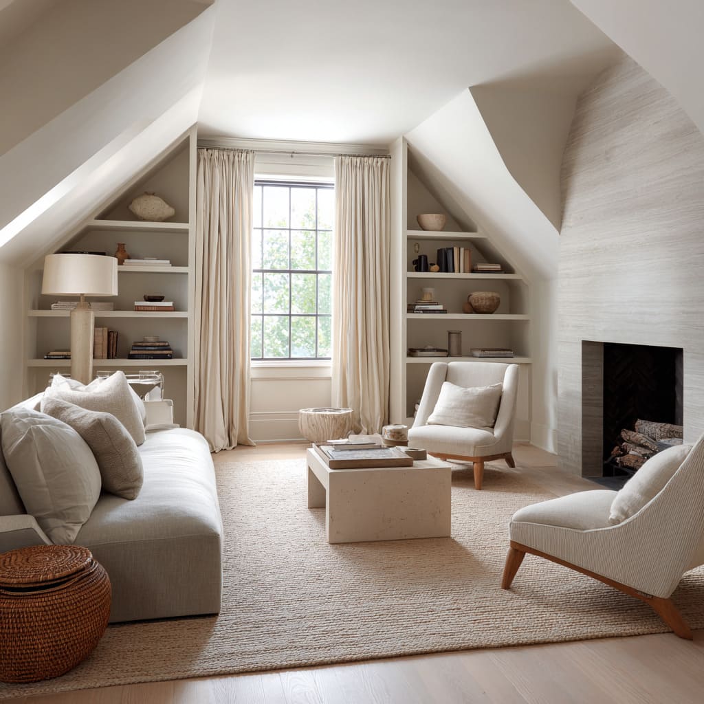 - Attic living rooms where walls, sloped ceilings, and built-ins are painted the same cream-sand.