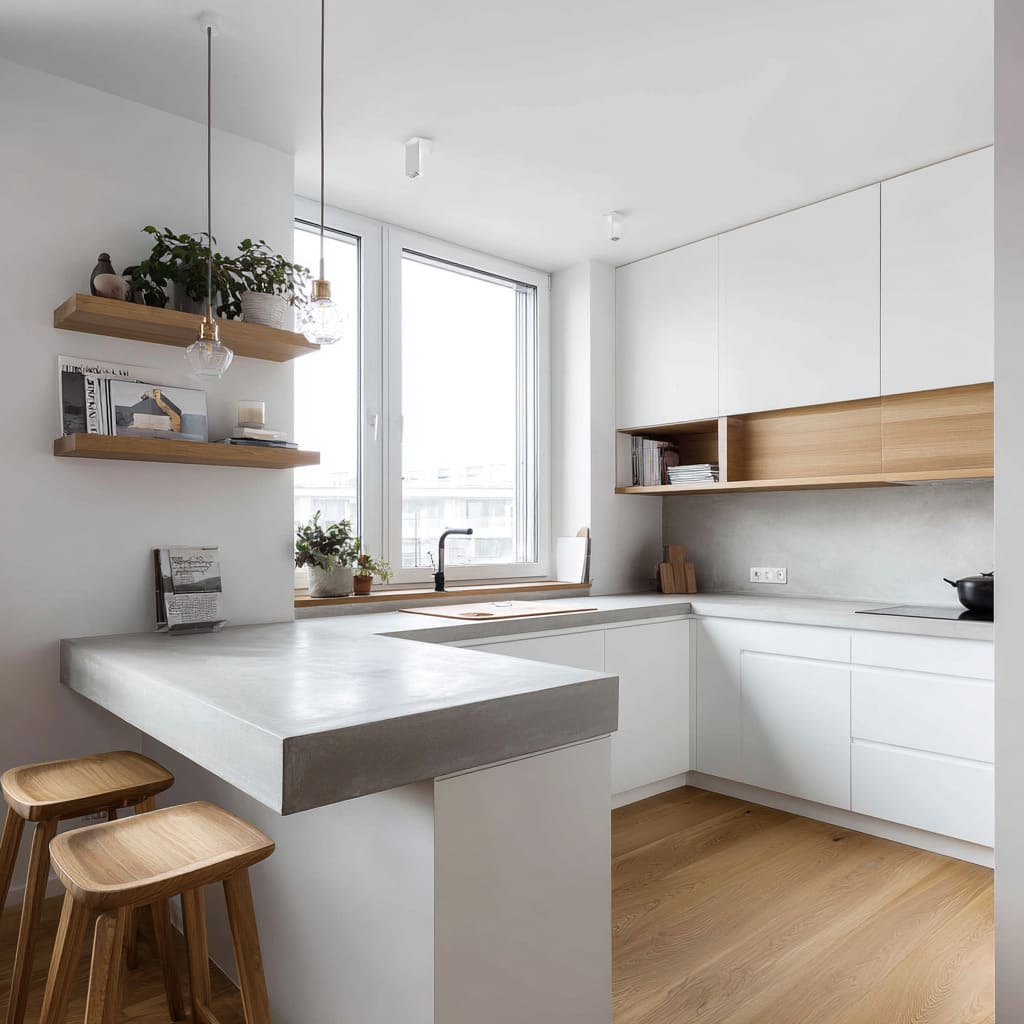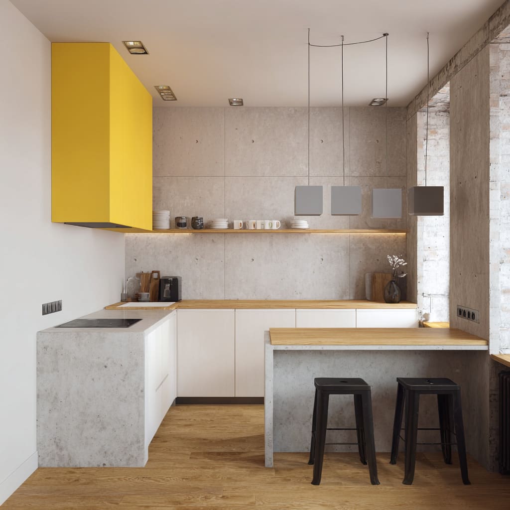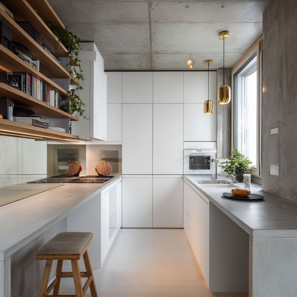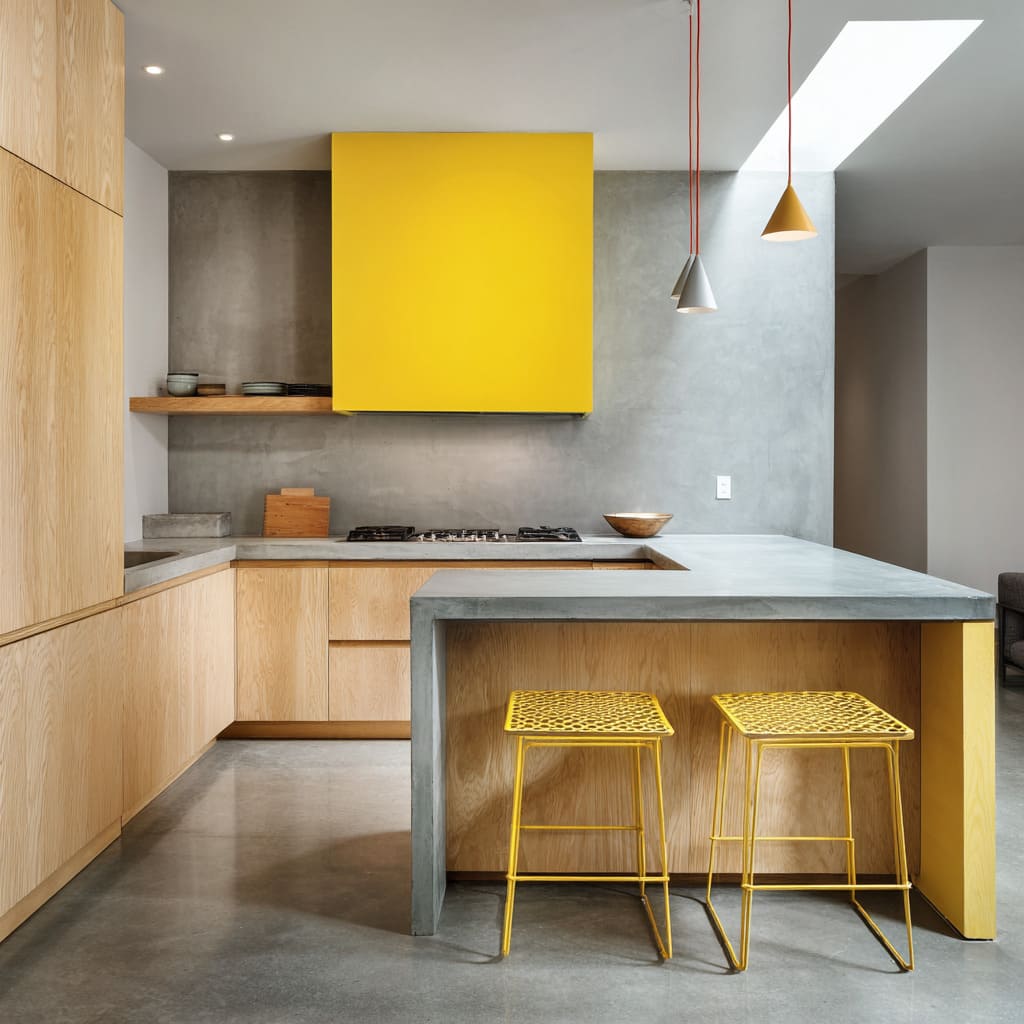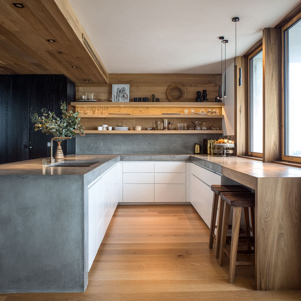 - Concrete used as a clean L-shape or U-shape outline: the counter becomes the line that draws the plan of the kitchen.