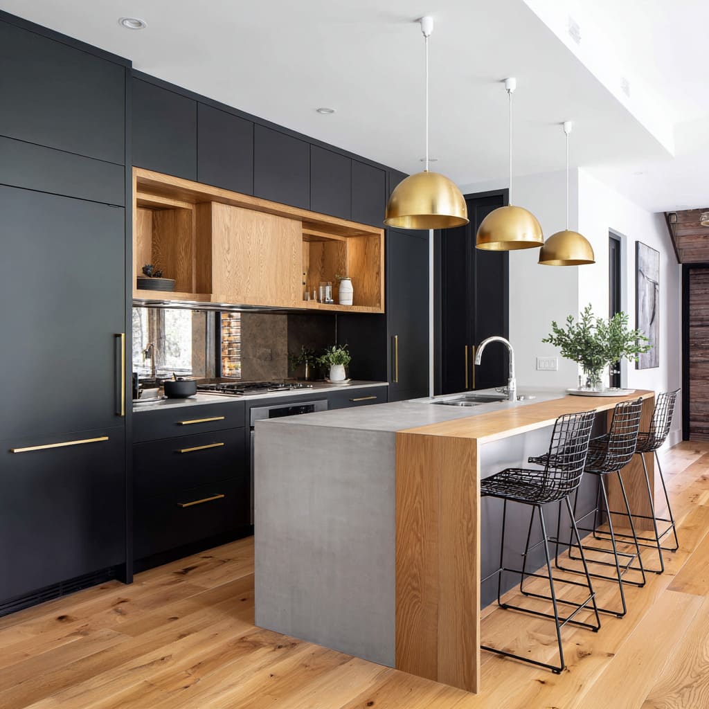 - Wood at touch level: stool seats, a wood bench edge attached to the island, or a wood panel on the seating side of the island. It changes the emotional read of the island from “block” to “furniture.”