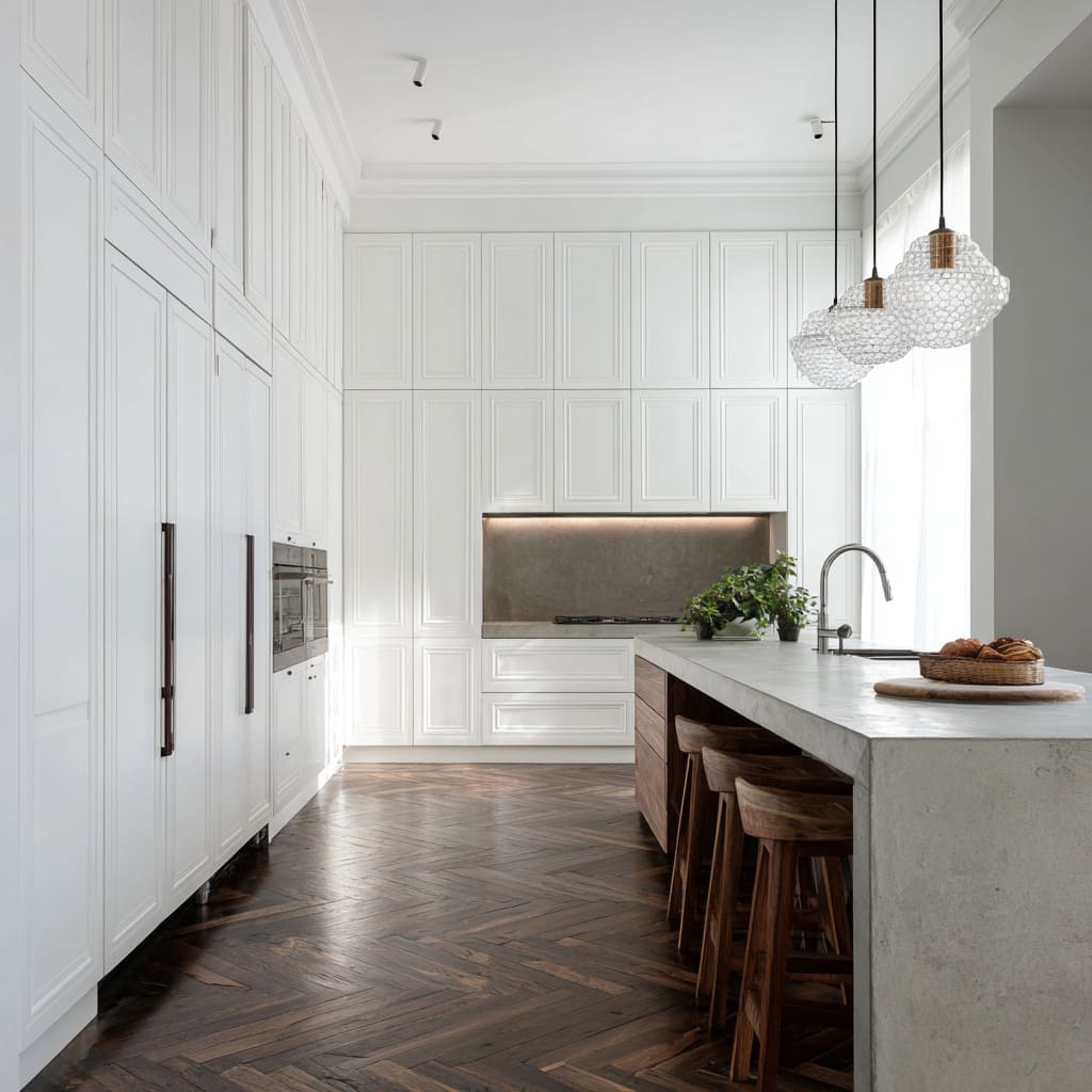 - All-white + concrete + warm wood bands: concrete gives weight; wood keeps it human.
