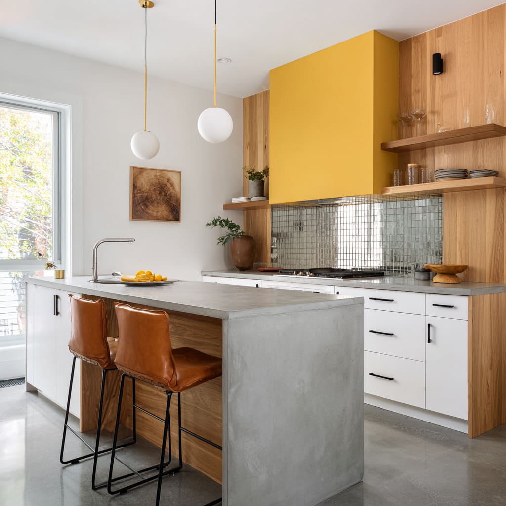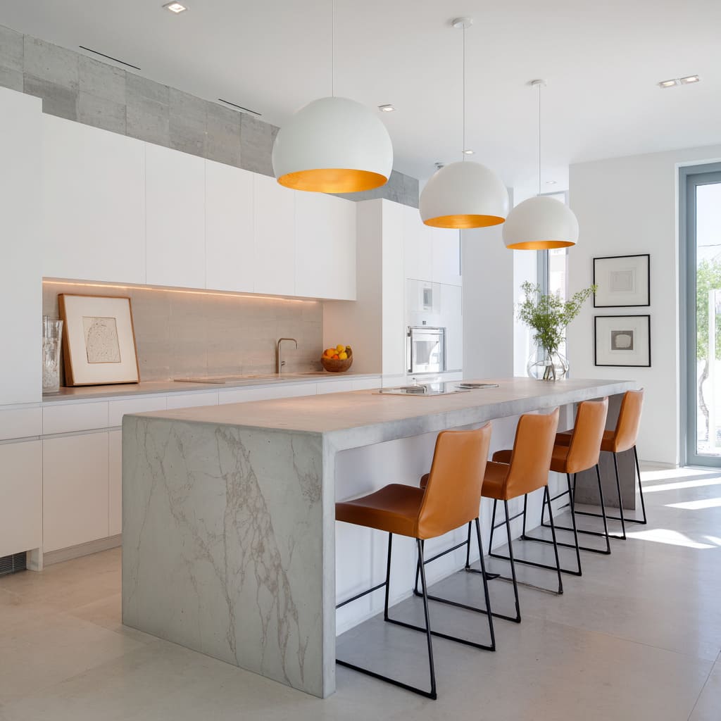 - Concrete can be concentrated in long horizontal bands (counter run, low backsplash band, one waterfall end) rather than many separate blocks.