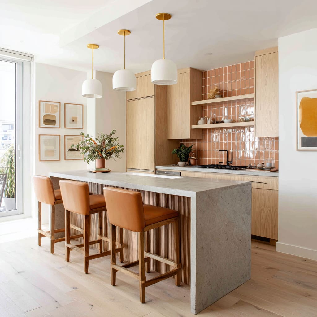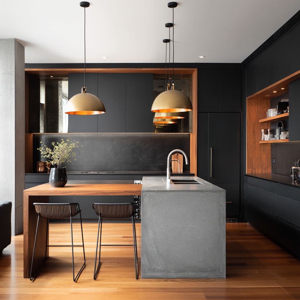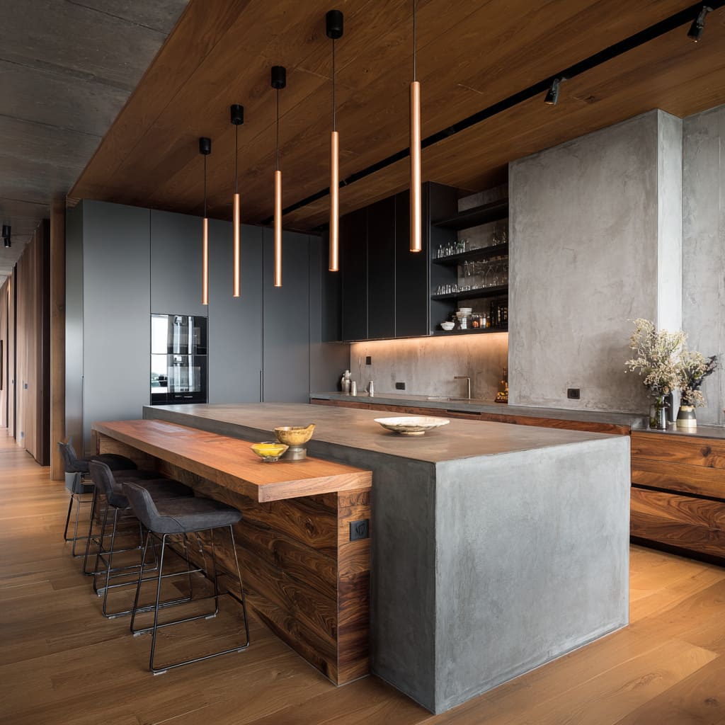 This is the core behind many concrete countertop kitchen ideas that feel upscale rather than industrial: concrete stays mineral and steady, while wood and leather handle comfort.