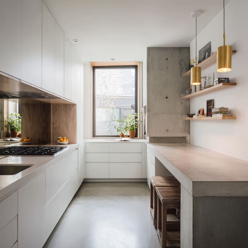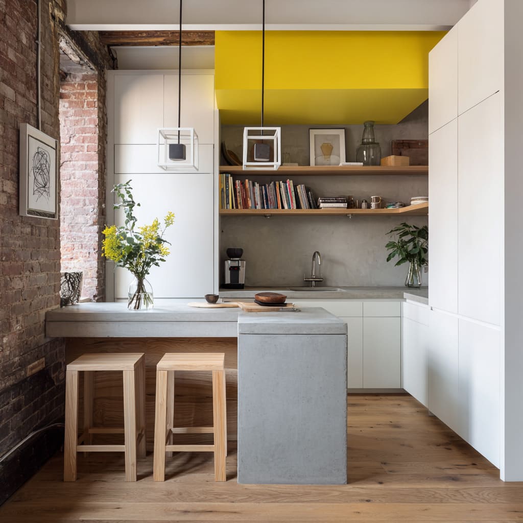 - Exposed brick + concrete + white planes: concrete relates to brick as a mineral cousin; white cabinetry becomes visual silence.