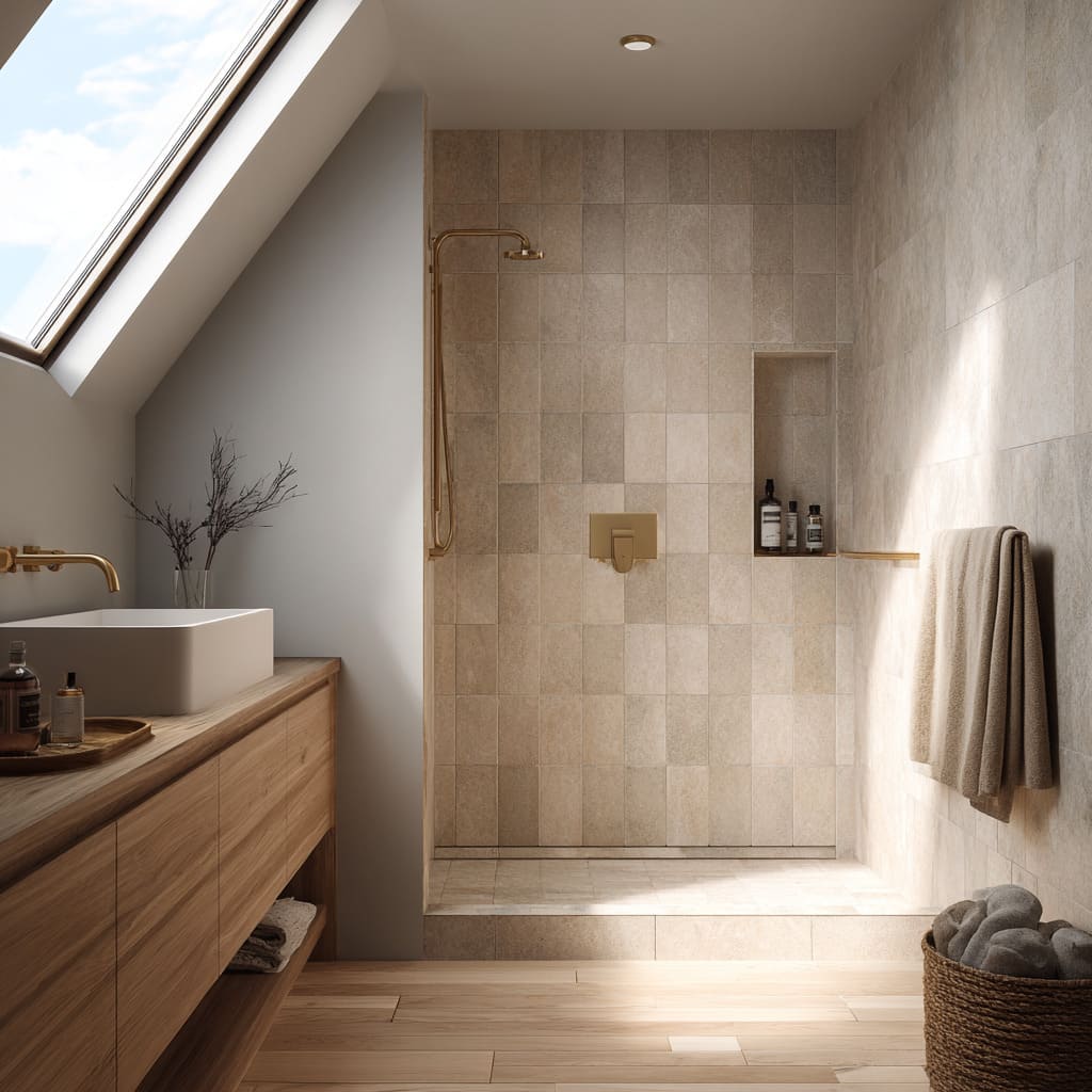 Such balanced compositions embody the spirit of elevated bathroom tiles ideas for small bathrooms, since placing one active surface in the right place allows compact rooms to feel purposeful and sophisticated.