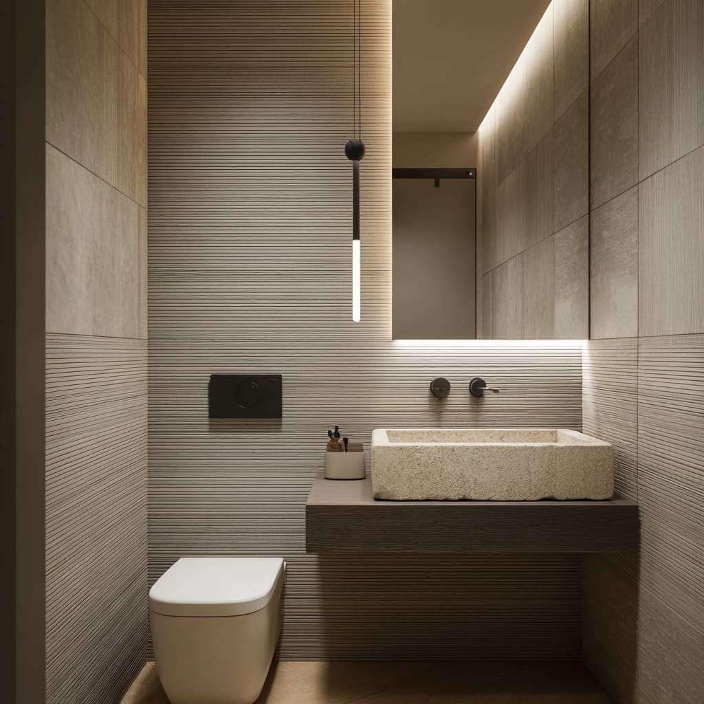 Soft horizontal ribs often serve to visually lengthen a narrow layout. When used behind basins or toilets, they act like visual expansion bars, letting the room feel wider and more relaxed.