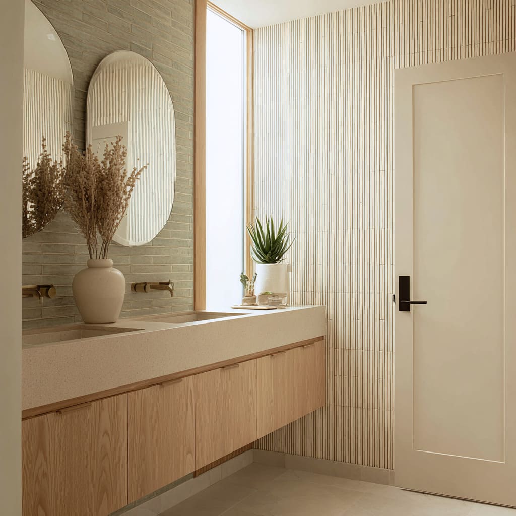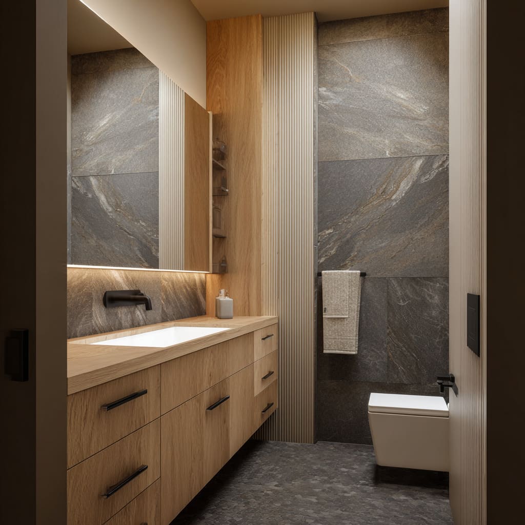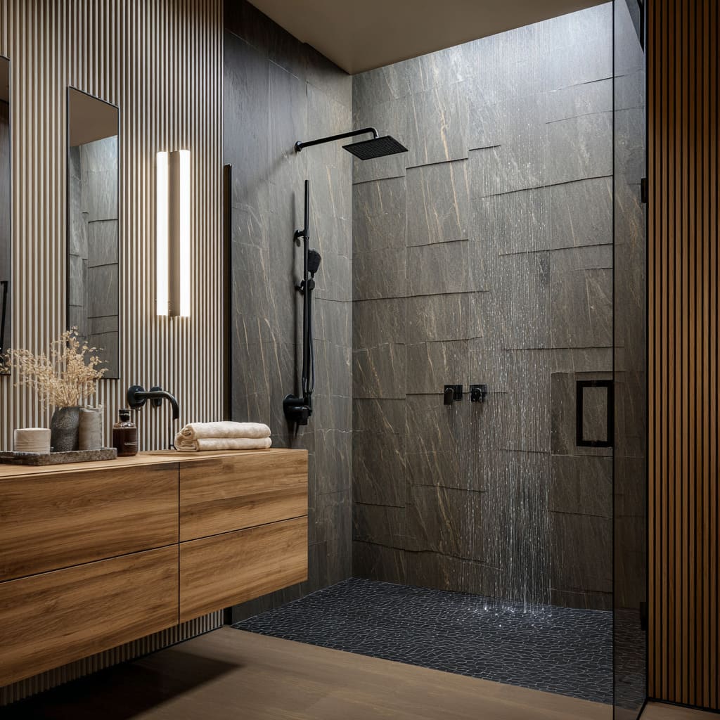 Warm wood appears beside ribbed tile or large stone to soften the atmosphere. Floating vanities in oak or ash bring horizontal calm beneath vertically structured walls.
